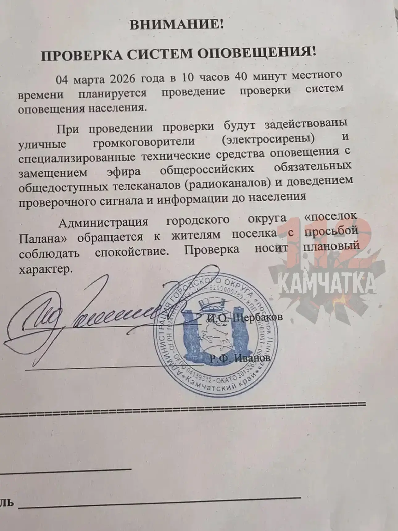 Сообщает читатель 112 КАМЧАТКА