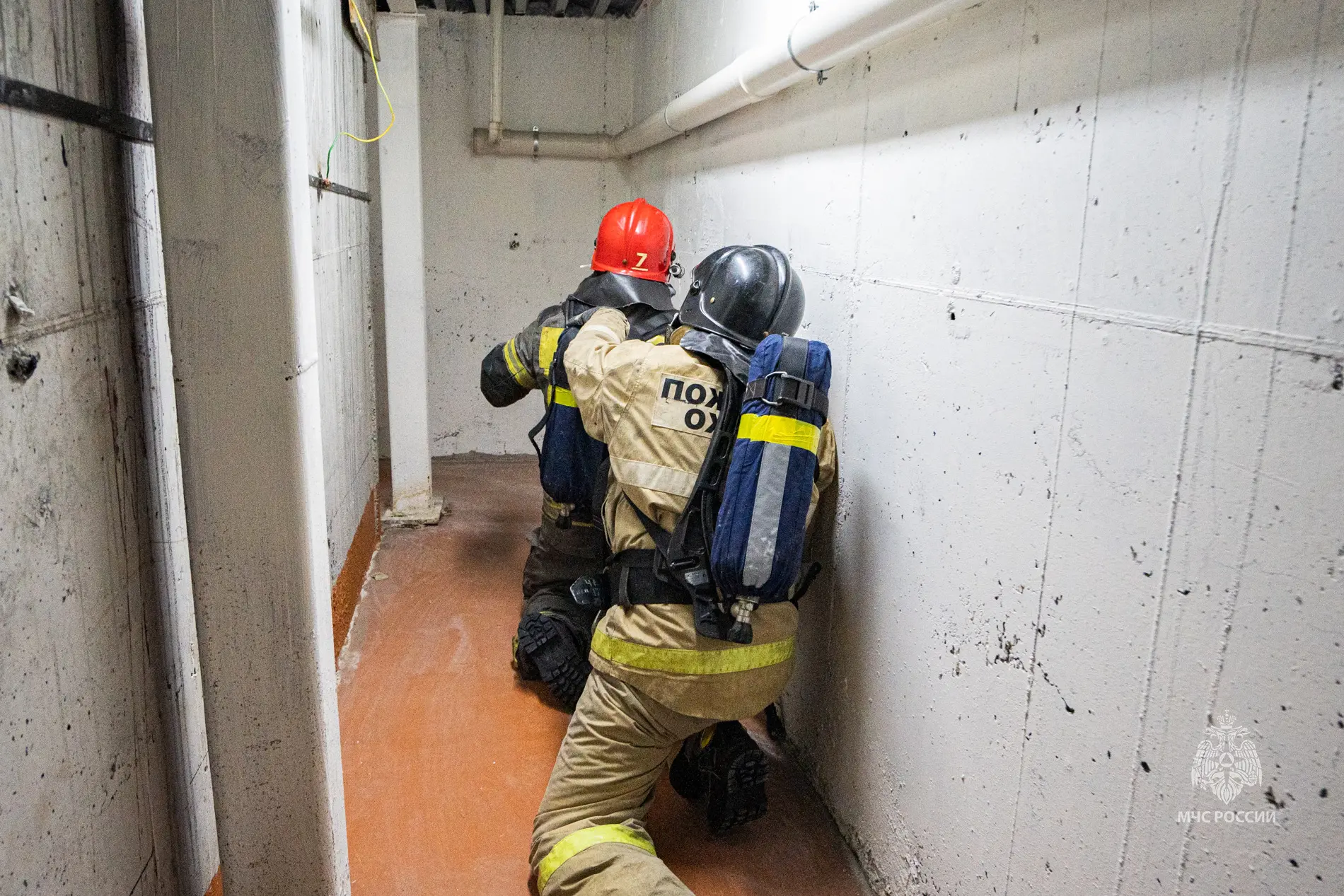 В подвальном помещении поиски очага пожара и пострадавших усложнялись работой вслепую. Заклеенные маски дыхательных аппаратов имитировали задымленность, какой бы она была в случае возникновения реального пожара.