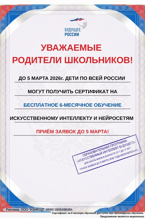 🎓До 5 марта каждый ребенок в возрасте от 7 до 17 лет может получить сертификат на 6 месяцев бесплатного обучения искусственному интеллекту и нейросетям.