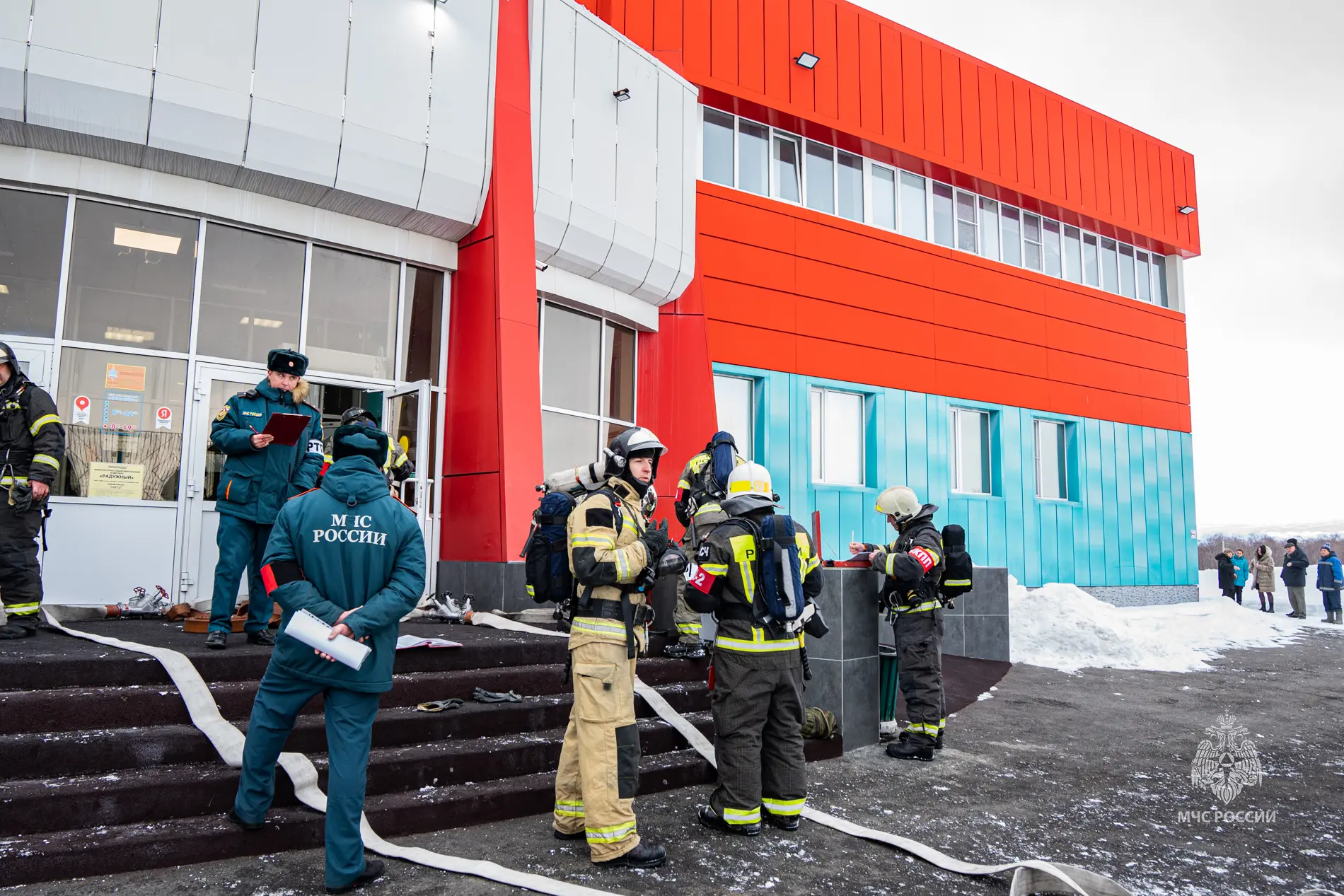 В физкультурно-оздоровительном комплексе «Радужный» в городе Елизово прошли пожарно-тактические учения. В результате «поджога» в здании огонь распространялся из двух очагов пожара. Горели мастерская в подвальном помещении и инвентарная комната в спортзале.