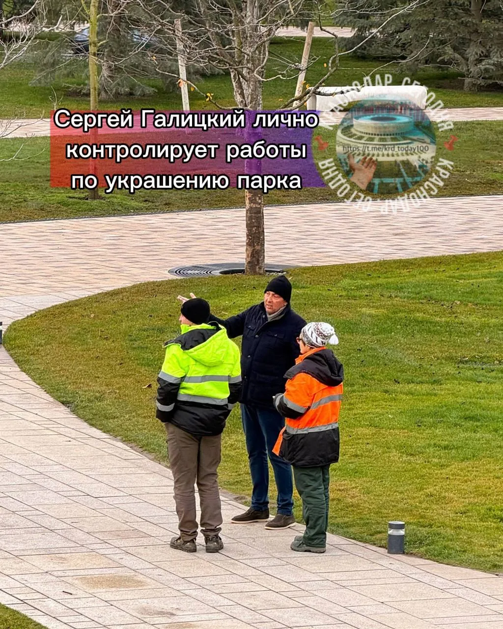 Владелец и основатель парка «Краснодар» Сергей Галицкий лично посетил парк. Мецената заметили на одной из дорожек, где он стоял с рабочими и, по всей видимости, обсуждал новогодние украшения.