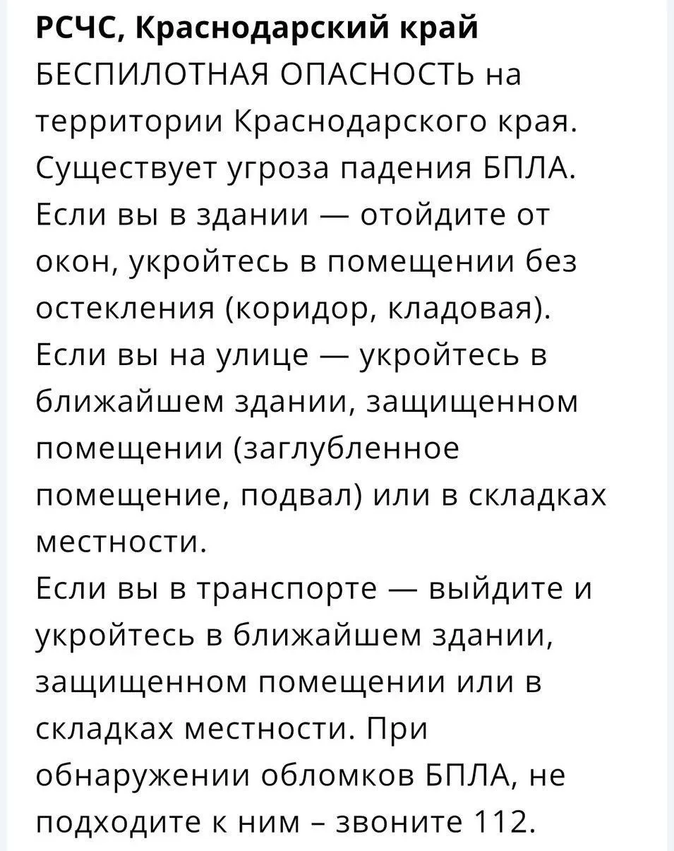 ❗️Беспилотная опасность объявлена в Краснодаре и в Краснодарском крае!