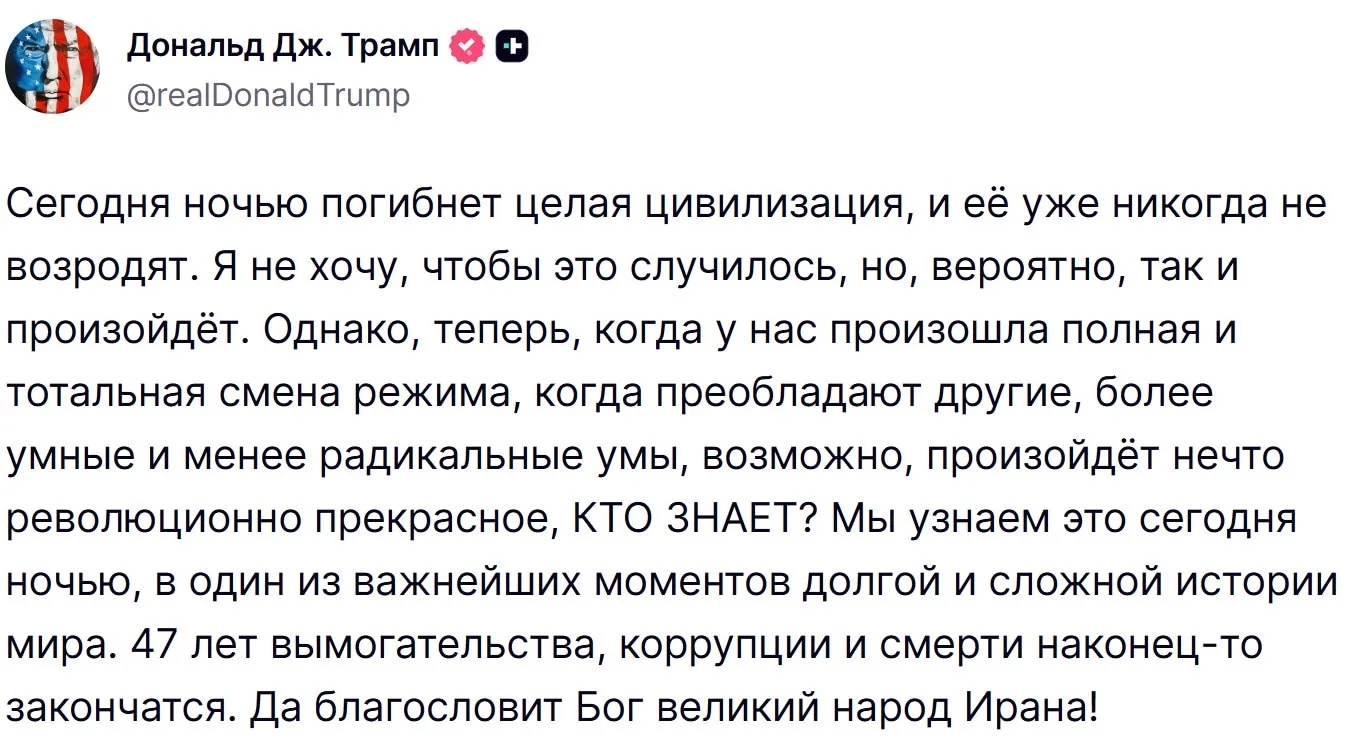 Ранее Трамп заявил, что сегодня ночью может погибнуть целая цивилизация, которую уже никогда не возродят — Иран ждёт полное уничтожение, если власти не согласятся на сделку. Он обозначил крайний срок — до 3 ночи по Москве.