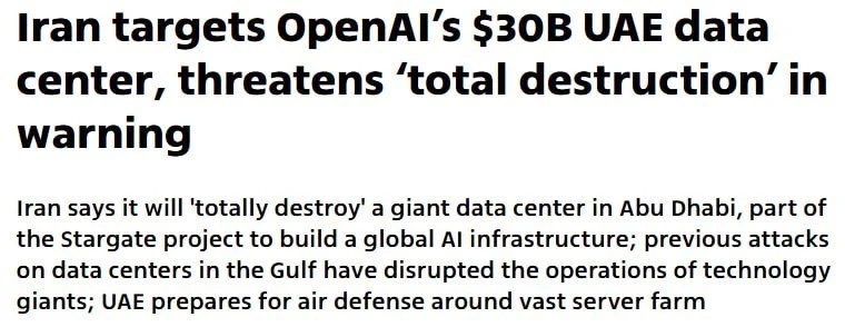 ⚡️Иран угрожает уничтожить дата-центр OpenAI в Абу-Даби стоимостью $30 000 000 000 — это ключевой объект глобальной инфраструктуры ИИ.