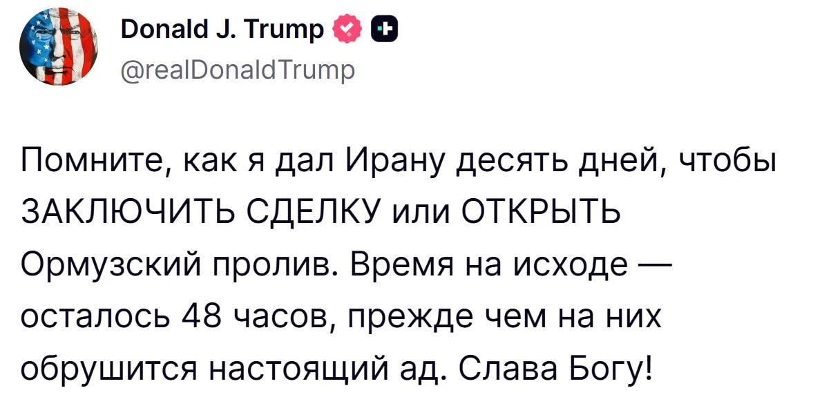 «Во вторник в Иране будет и «День электростанций», и «День мостов» — все в одном флаконе. Ничего подобного вы еще не видели!!! Откройте *** пролив, вы, сумасшедшие ублюдки, или будете жить в аду — ПРОСТО СМОТРИТЕ!» — написал он в Truth Social.