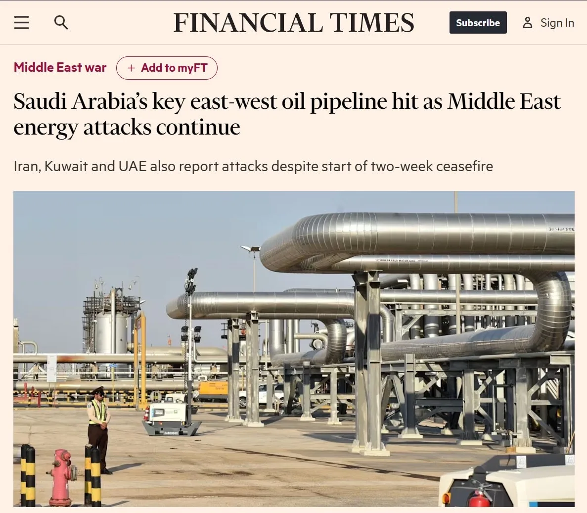 ⚡️В Саудовской Аравии атаковали ключевой нефтепровод на фоне перемирия, — Financial Times.
