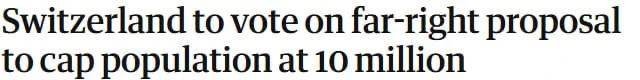 Звучит странно, но в Швейцарии будут голосовать за идею ограничить верхний предел населения страны в 10 млн человек. Инициатива обяжет правительство и парламент принять меры, если постоянное население страны, в настоящее время составляющее 9,1 млн человек, превысит 9,5 млн. Делать это будут путем отказа во въезде новоприбывшим, включая лиц, ищущих убежища.