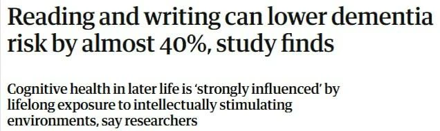 Ученые из Чикаго выяснили, что чтение или написание текстов снижают риск деменции на 38%. Исследователи 8 лет наблюдали за пожилыми людьми и выяснили: у тех, кто всю жизнь читал книги, учил языки или как-то был связан с литературой, болезнь Альцгеймера развивалась в среднем в возрасте 94 лет. А у тех, кто этого не делал — в 88.