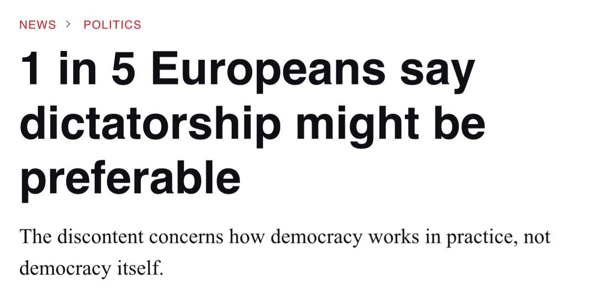 Каждый пятый европеец считает, что в некоторых случаях диктатура предпочтительнее демократии. Точнее, так считают во Франции, Греции, Швеции, Великобритании и Румынии. А каждый четвёртый согласился с утверждением: «Если бы в моей стране был способный и эффективный лидер, я бы не возражал, если бы он ограничил демократические права и не был подотчётен гражданам за свои действия».