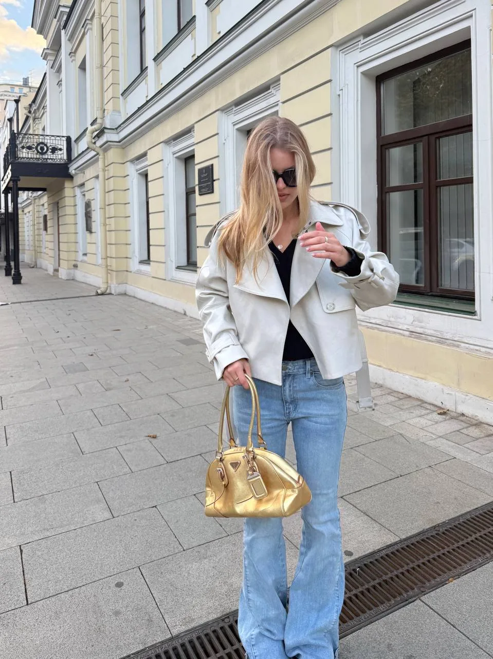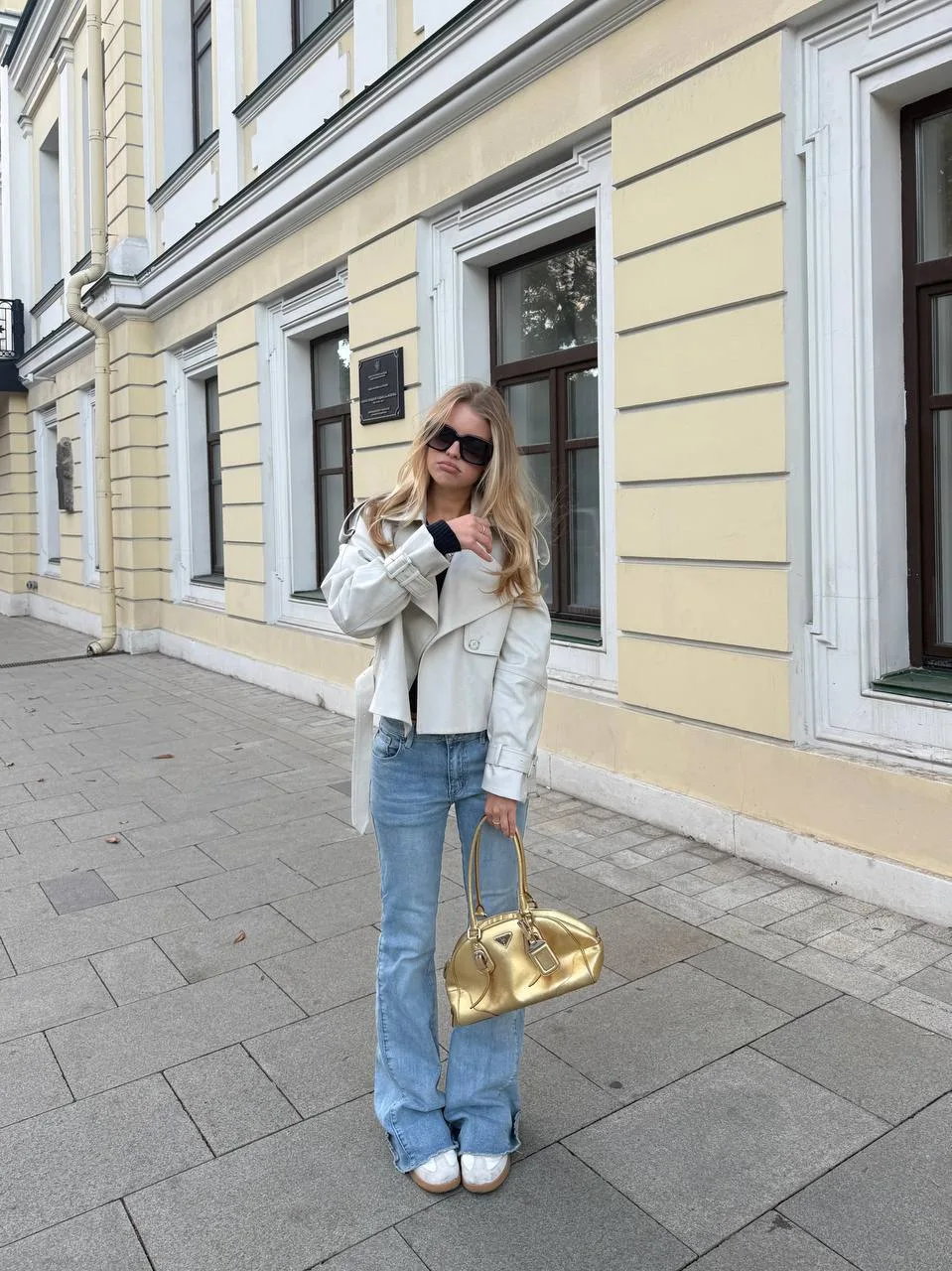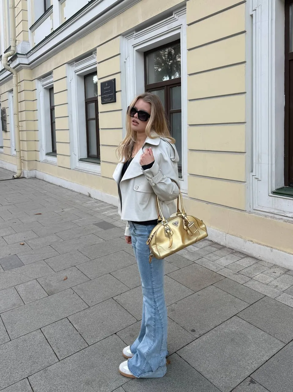 поэтому мой выбор пал на джинсы клеш, большие очки и яркий аксессуар в виде золотой сумочки!