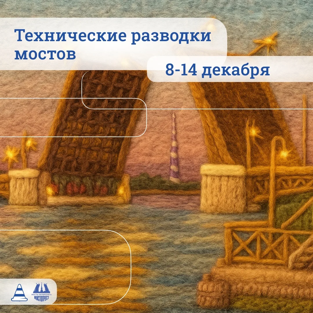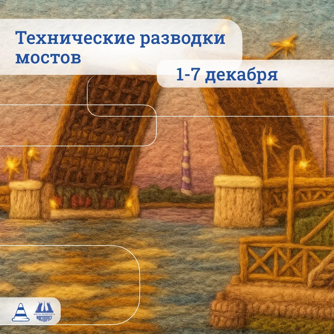 🌉Постоянные разводки мостов в 2025 году завершены, и специалисты «Мостотреста» приступают к межнавигационному обслуживанию переправ. Для этого проводятся технические разводки. В ночь с 1 на 2 декабря для профилактических работ будут разводиться Троицкий, Благовещенский и Тучков мосты.