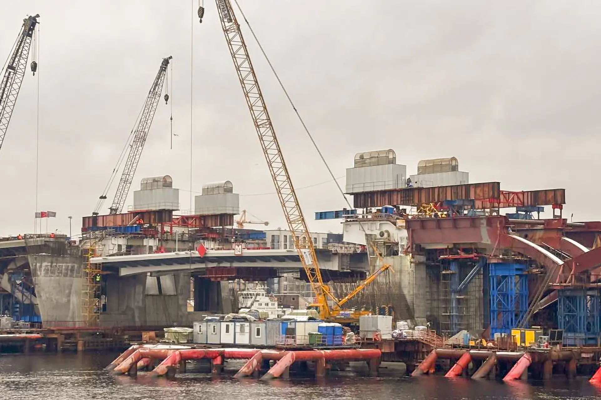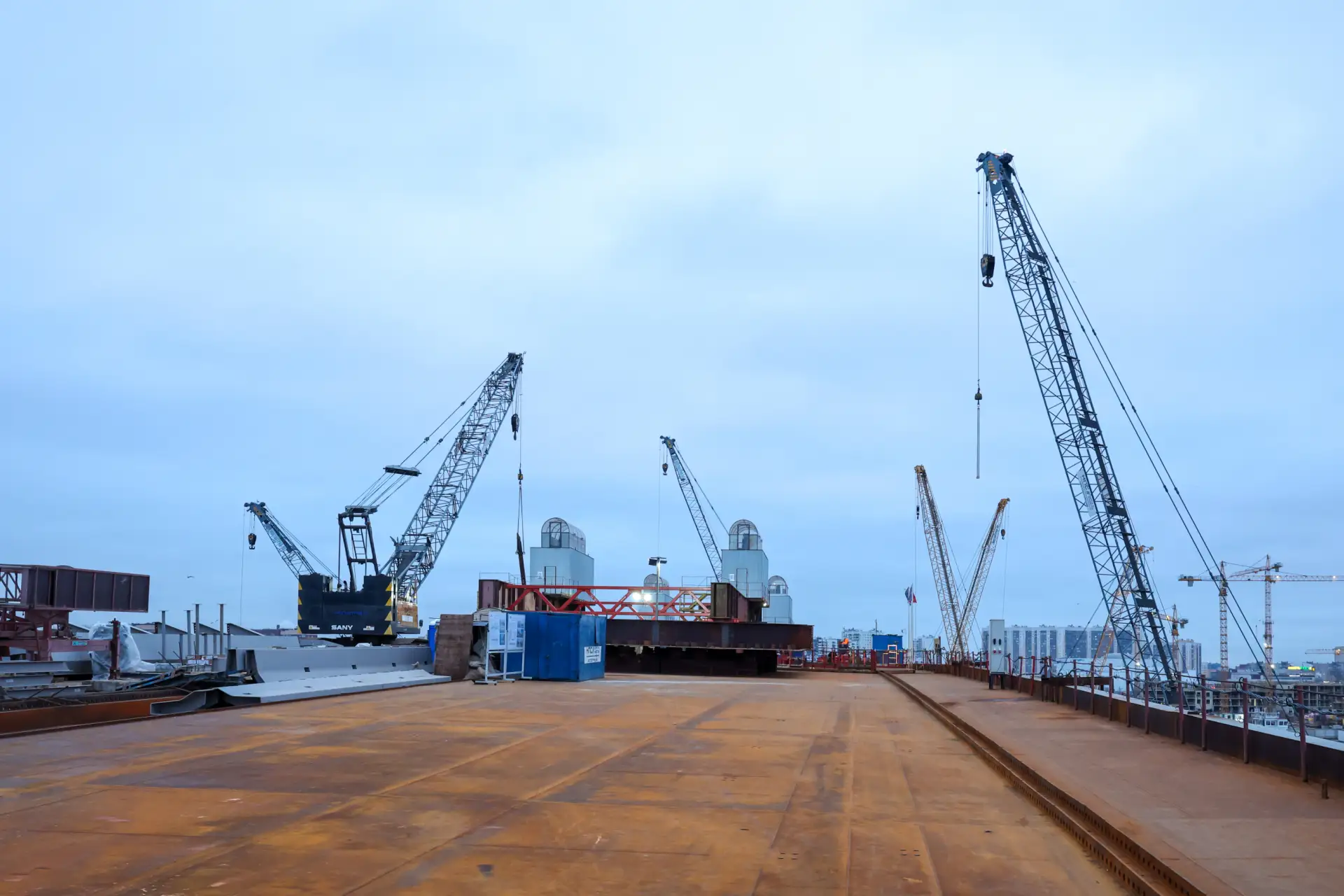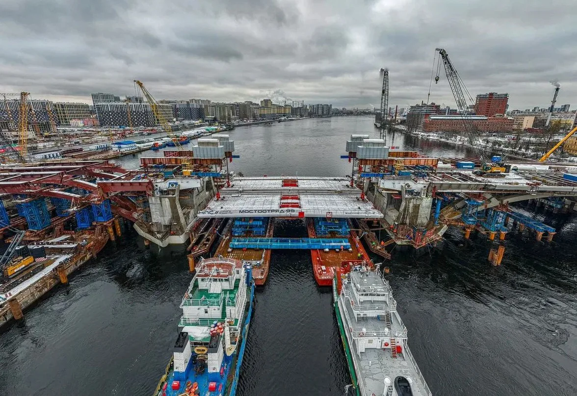Губернатор Санкт-Петербурга Александр Беглов с членами городского Правительства осмотрел ход строительства Большого Смоленского моста. На переправе выполнен важнейший этап – в проектное положение установили двукрылый разводной пролёт.