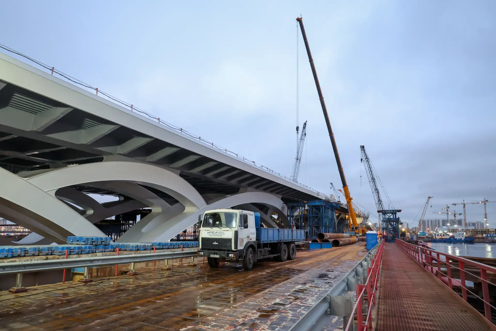 Специалисты АО «Дороги и Мосты» Нацпроектстроя доставили заранее собранный разводной пролет со стапеля на левом берегу Невы в акваторию реки, в створ между пятой и шестой опорами. После чего при помощи четырех домкратов и тросов подняли конструкцию на проектную высоту и надежно закрепили «приемными консолями».