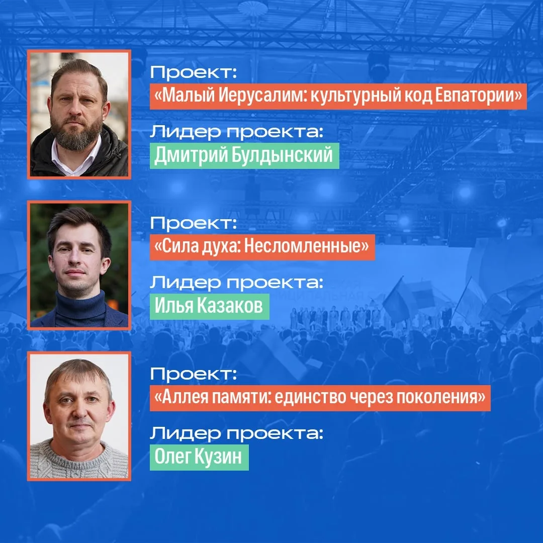 В номинации «С передовой СВО в муниципалитет» республику представляет Илья Казаков из Алушты. От Джанкойского района в номинации «Укрепляем партнёрство» участвует проект «Аллея памяти: единство через поколения». Евпаторию в номинации «Единство народов России» представляет проект «Малый Иерусалим».