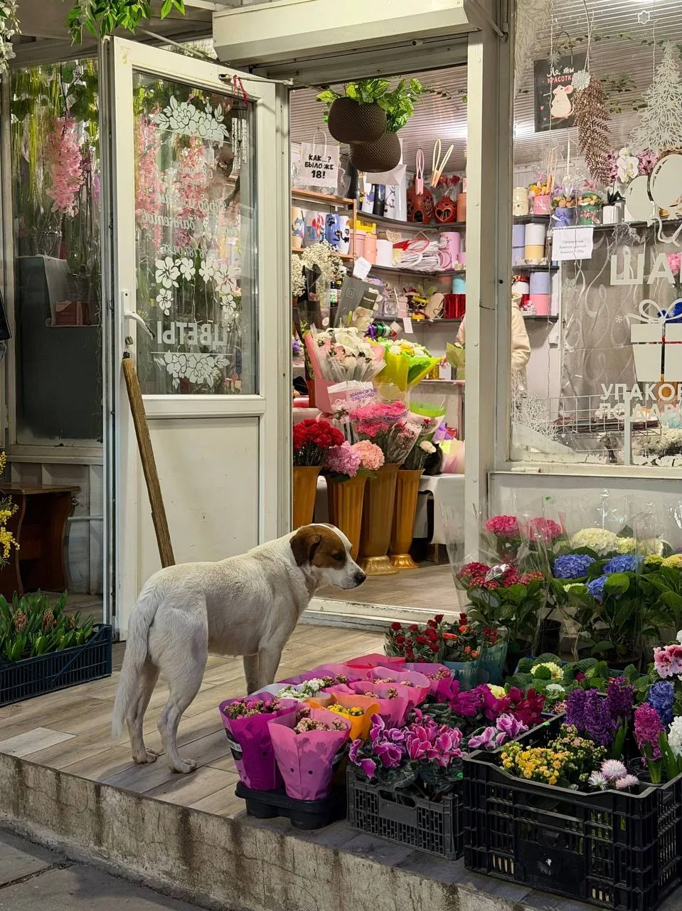 Крымский пёс присматривает букет к празднику и хочет успеть купить его до резкого подорожания.