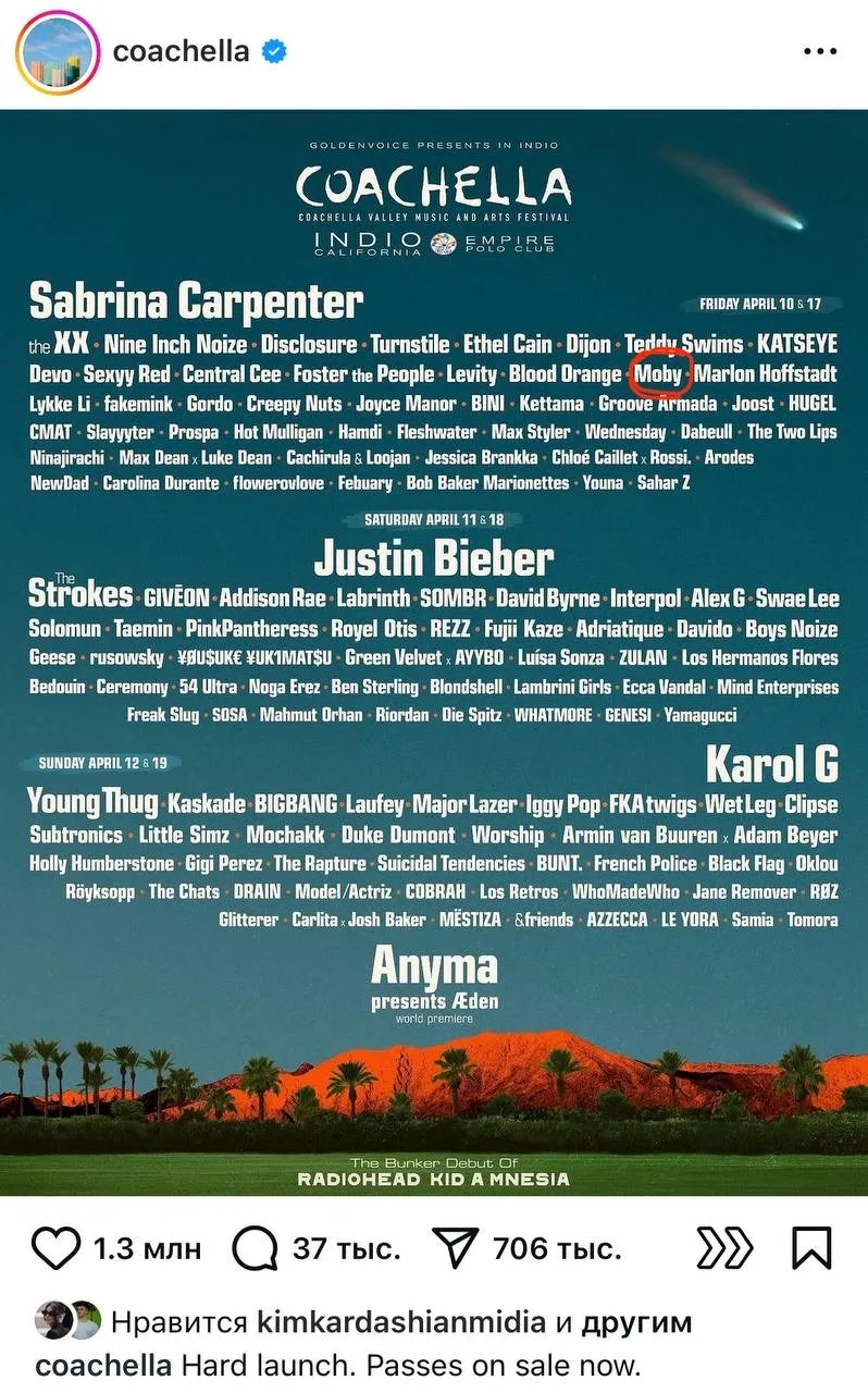 Смотрю многочисленные видео с Коачеллы с Джастином Бибером, Сабриной Карпентер и другими фрешменами, но реальное «вау» поймала от выступления Moby, чье имя прописано мелким шрифтом в лайн-апе, что абсолютно не отражает его величия. На сцене с ним Джейкоб Ласк