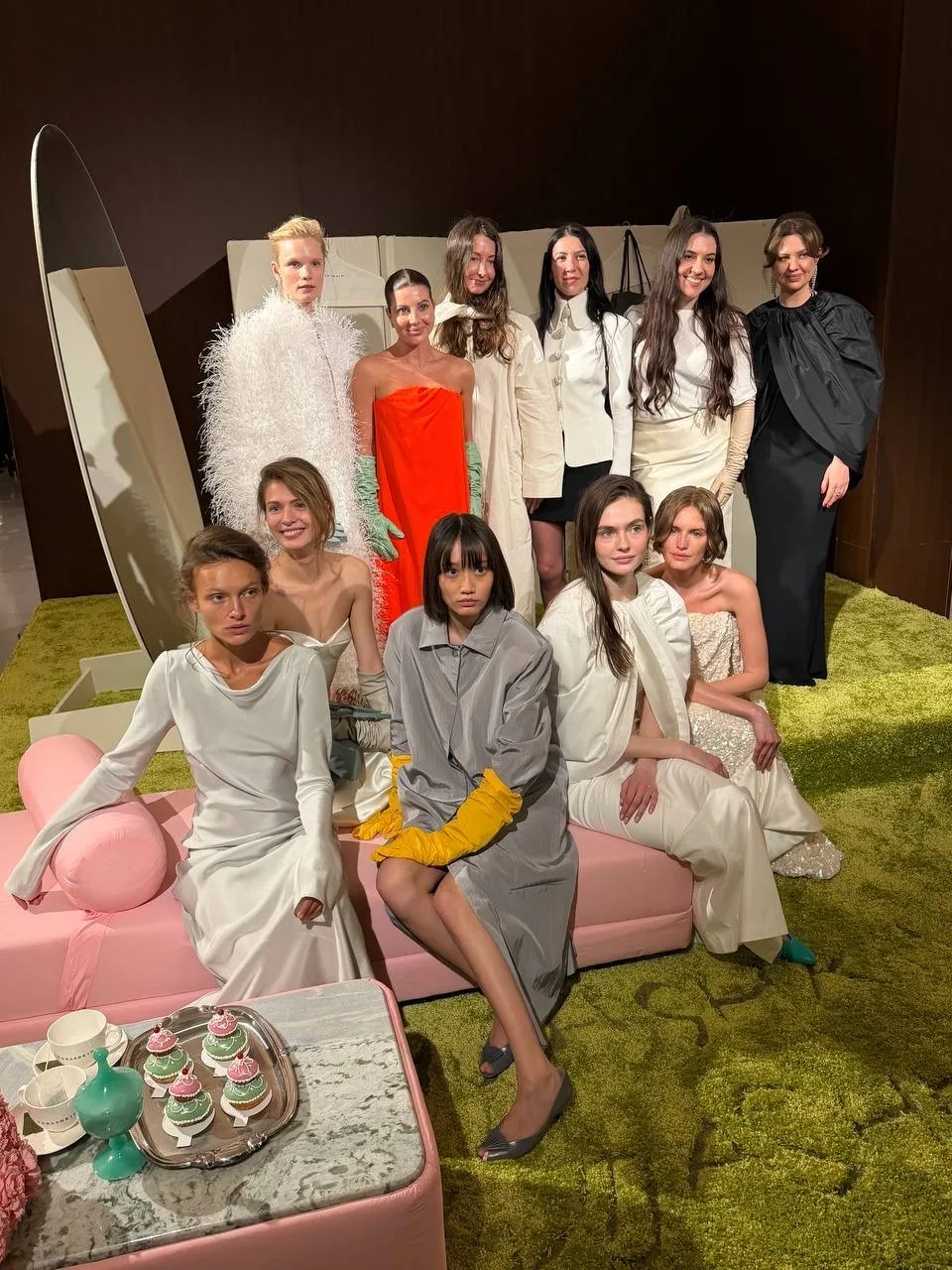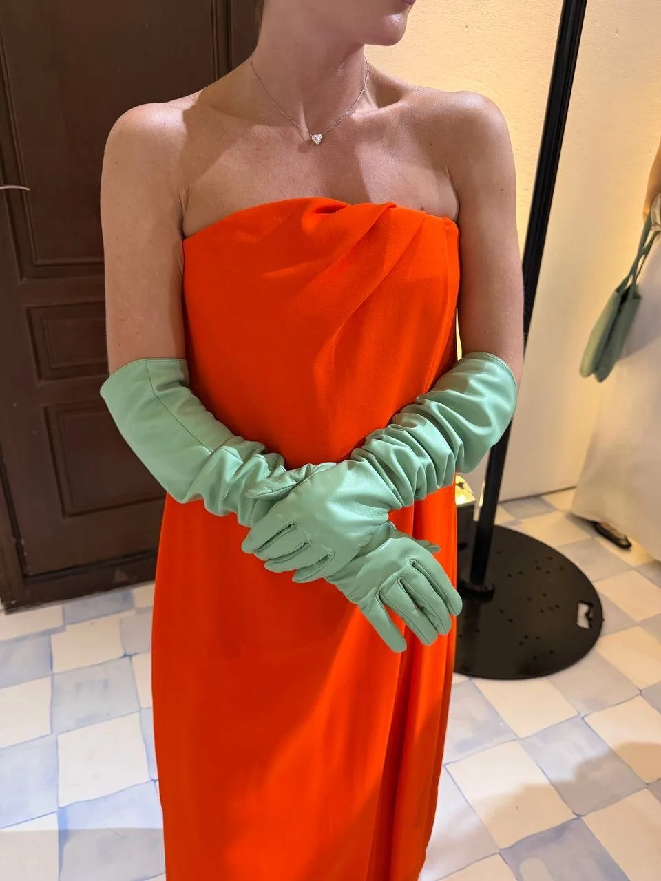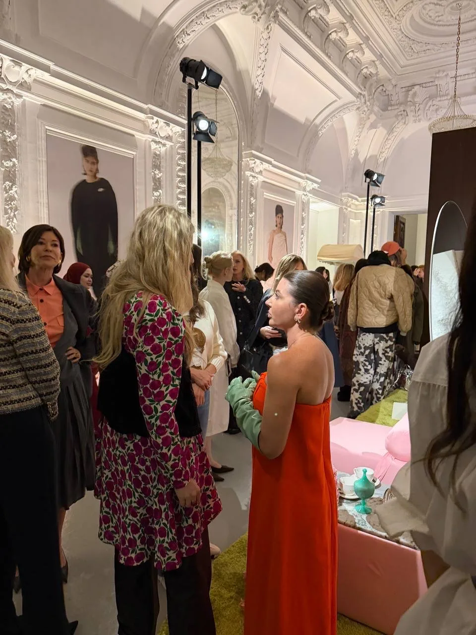 Галина весь вечер презентации стойко выдержала и тонну внимания, и сложный оранжево-красный цвет платья в очень красивом сочетании с трендовыми мятными перчатками — дебютные позиции бренда.