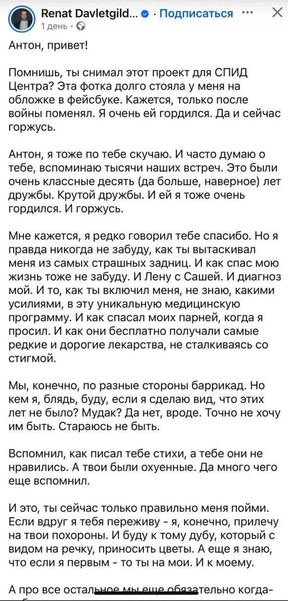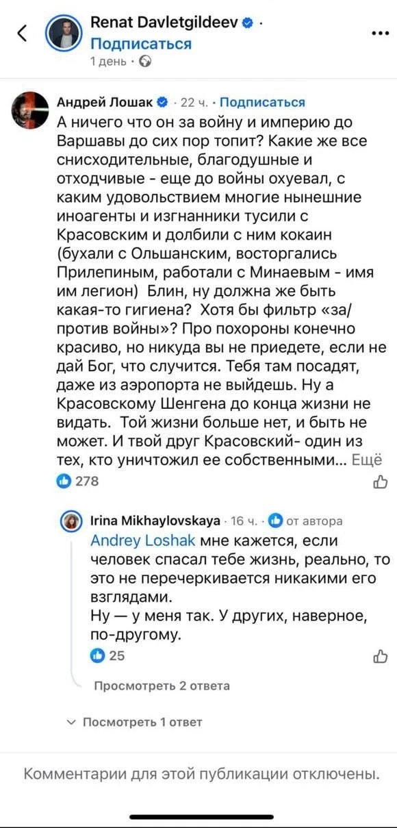 На моем канале вышло интервью с моим бывшим коллегой и партнером по многим медийным проектам Антоном Красовским. Посмотрите, пожалуйста - это действительно «разговор о важном». Здесь скрины постов после интервью тоже моих коллег - Рената Давлетгильдеева* и Андрея Лошака*.