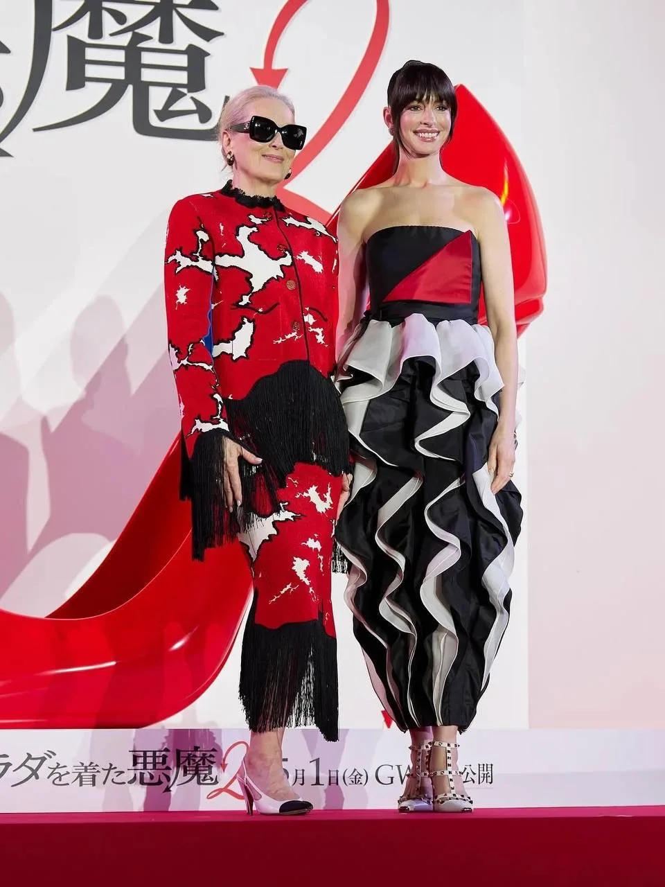 Нравится нам это или нет, но апрель пройдет под знаменем «Дьявол носит Prada 2». Новой точкой на карте промо-тура стала Япония, где Энн Хэтэуэй в Valentino ss’25 Couture и Мерил Стрип в Chanel pf’26 уже успели пройтись по красной дорожке и оставить автографы на дьявольской туфле.