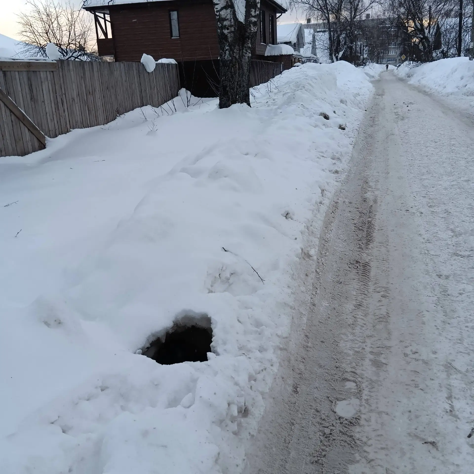 На улице Герцена, прямо напротив дома №8, уже много лет существует достаточно глубокий провал. Зимой он особенно опасен: сугробы полностью скрывают его, так что днём можно запросто провалиться, не заметив, а уж ночью его совсем не видно.