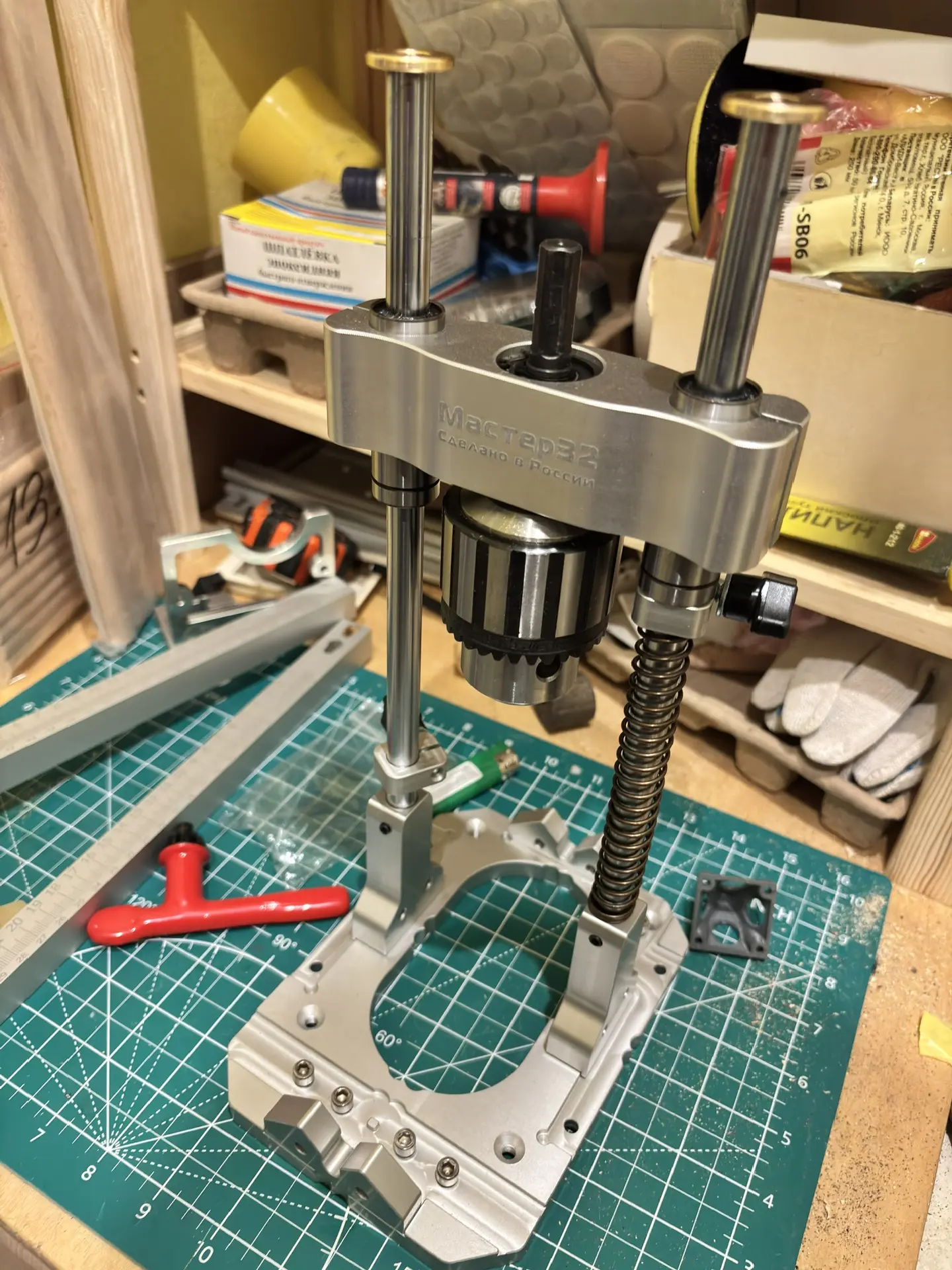 Это основание с двумя удобными рукоятками и пружинным механизмом, которое позволяет опускать фрезу строго вертикально в любом месте заготовки.