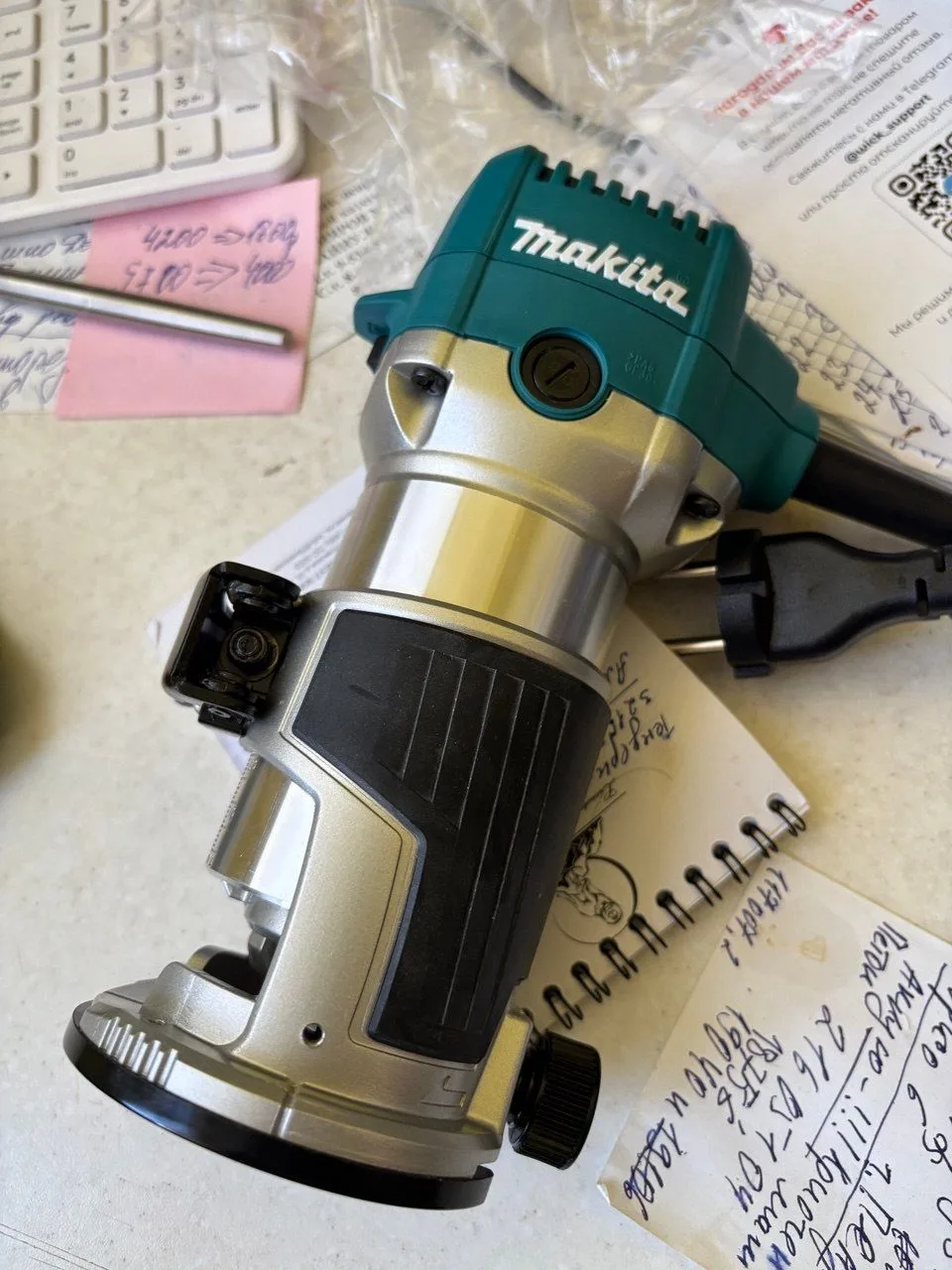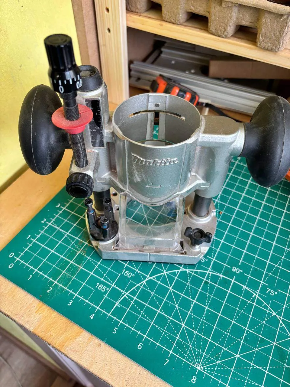 Стандартная база , идущая в комплекте с фрезером Makita RT0702, отлично справляется с обработкой кромок и прямолинейным фрезерованием. Но её главный недостаток — фреза всегда находится на фиксированной глубине. Чтобы сделать паз, вам придётся подводить фрезу к краю заготовки.