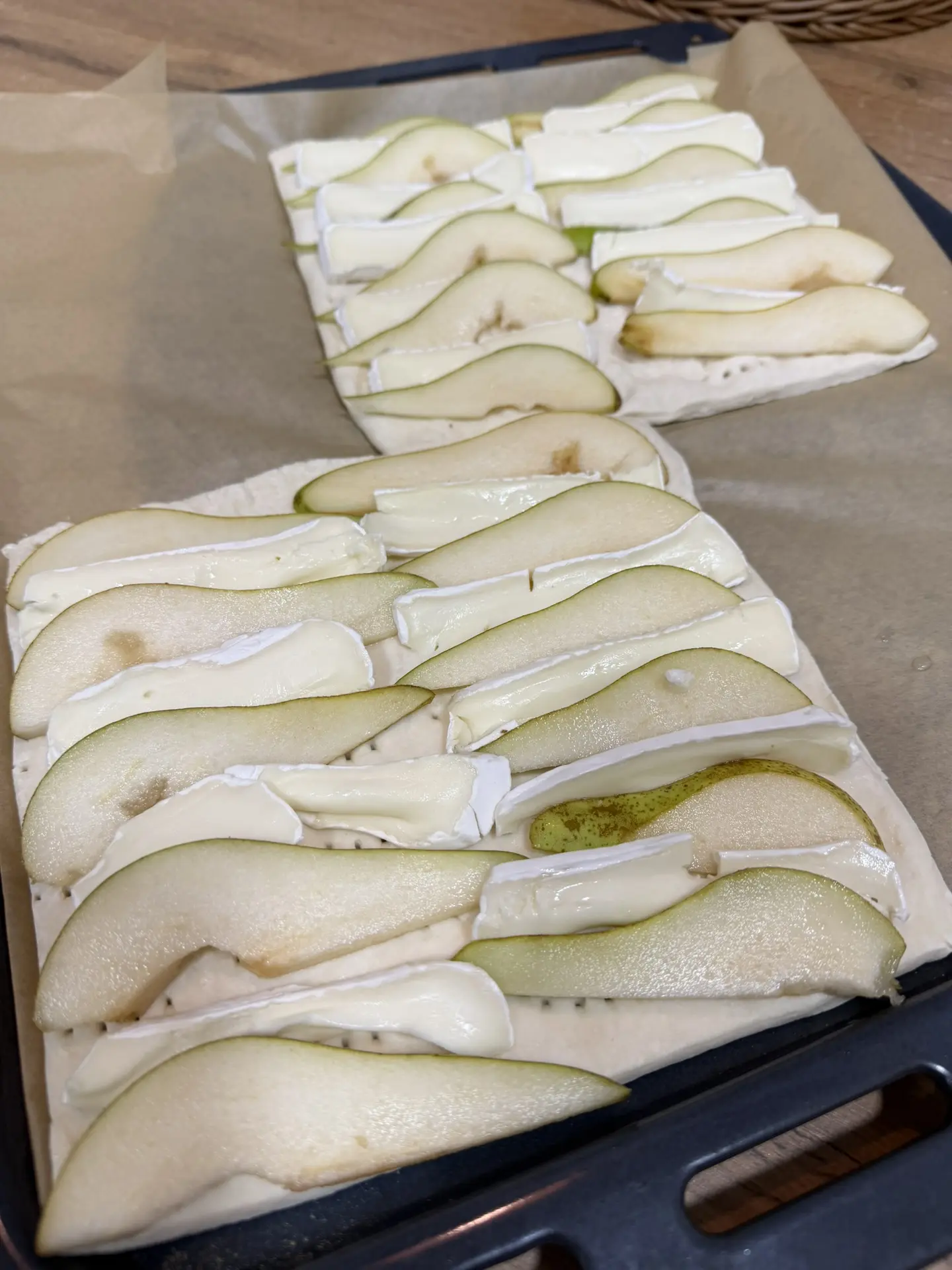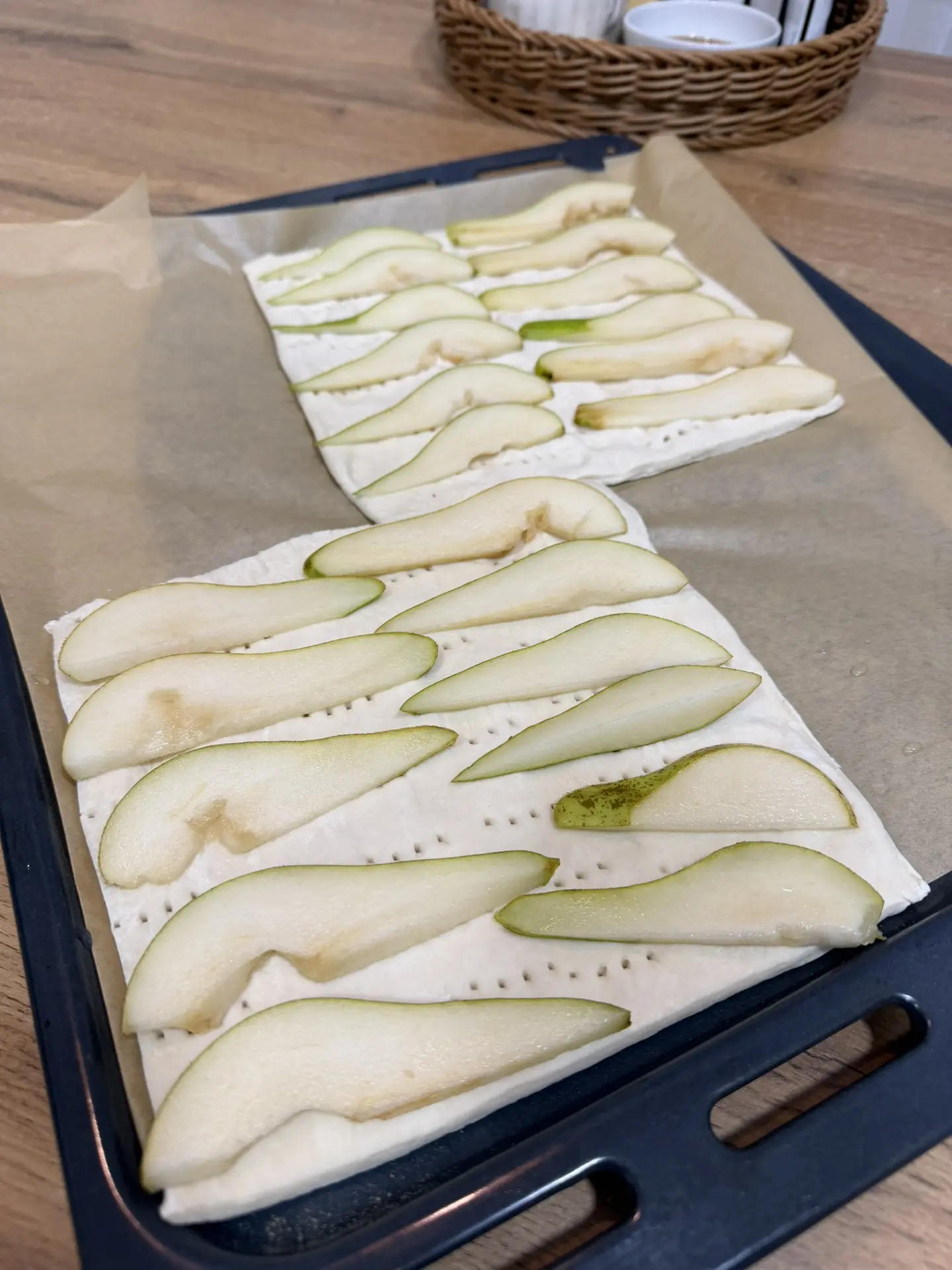 -грушу разрезаем пополам, вынимаем косточки, нарезаем, выкладываем на тесто