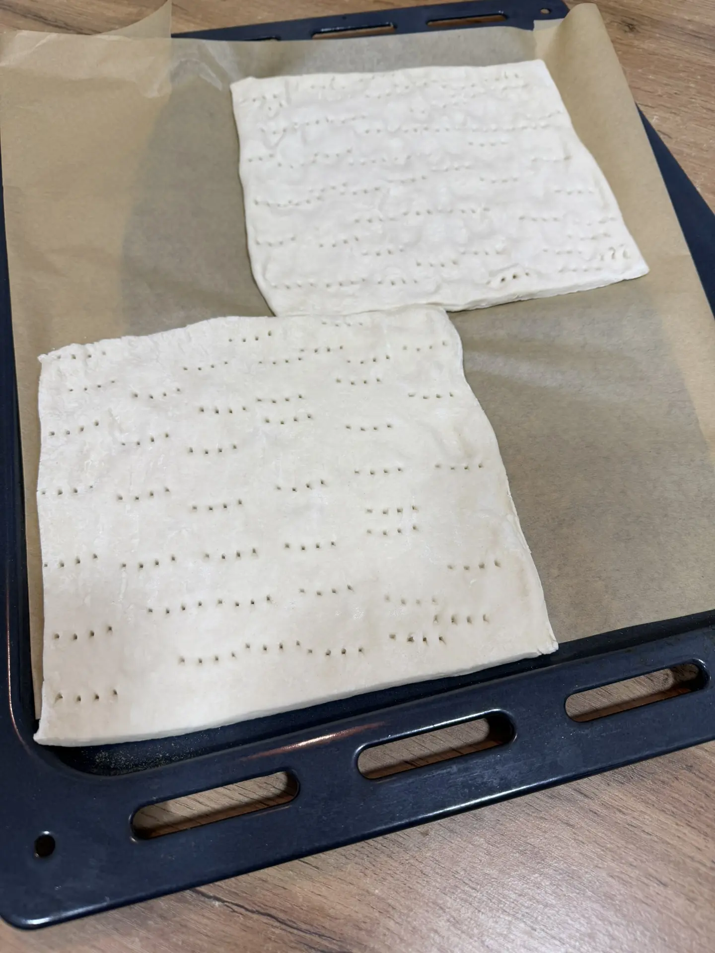 -Выкладываем на противень застеленной бумагой, слегка придавливаем руками и делаем проколы вилкой