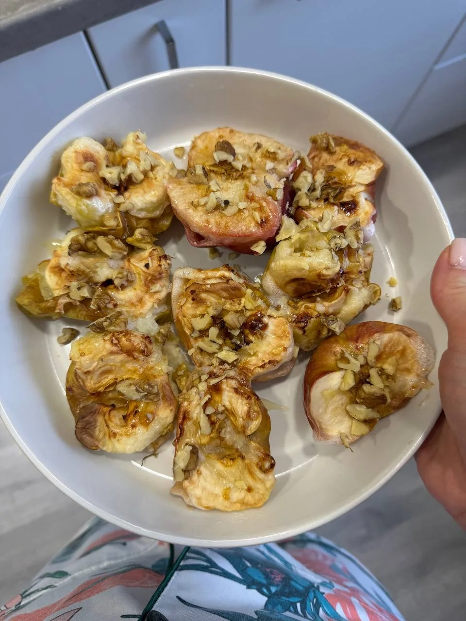 -На готовый горячий десерт посыпаем грецким измельченным орехом, можно мед сверху, но не спешите, попробуйте, возможно без него будет вам сладко.