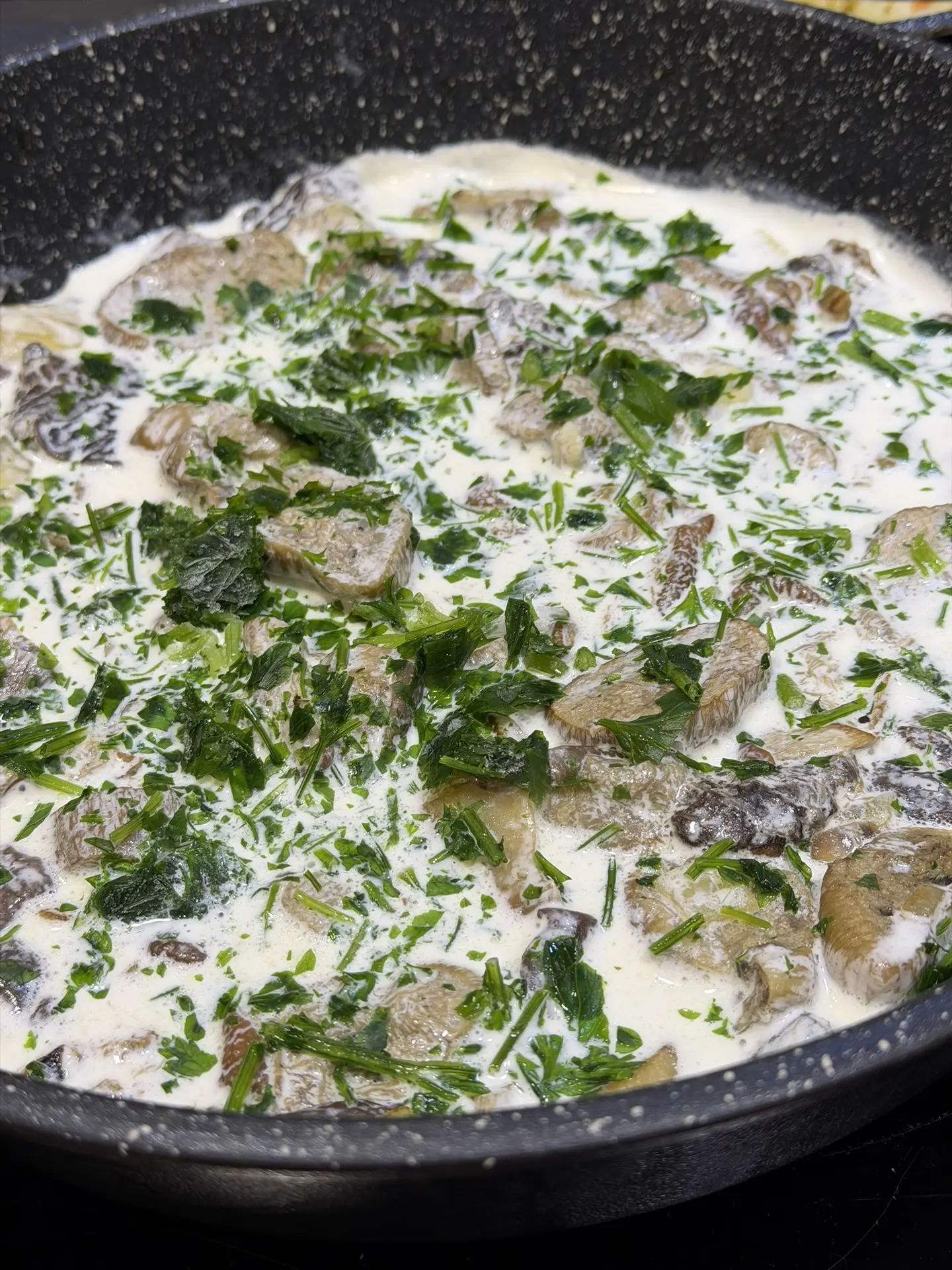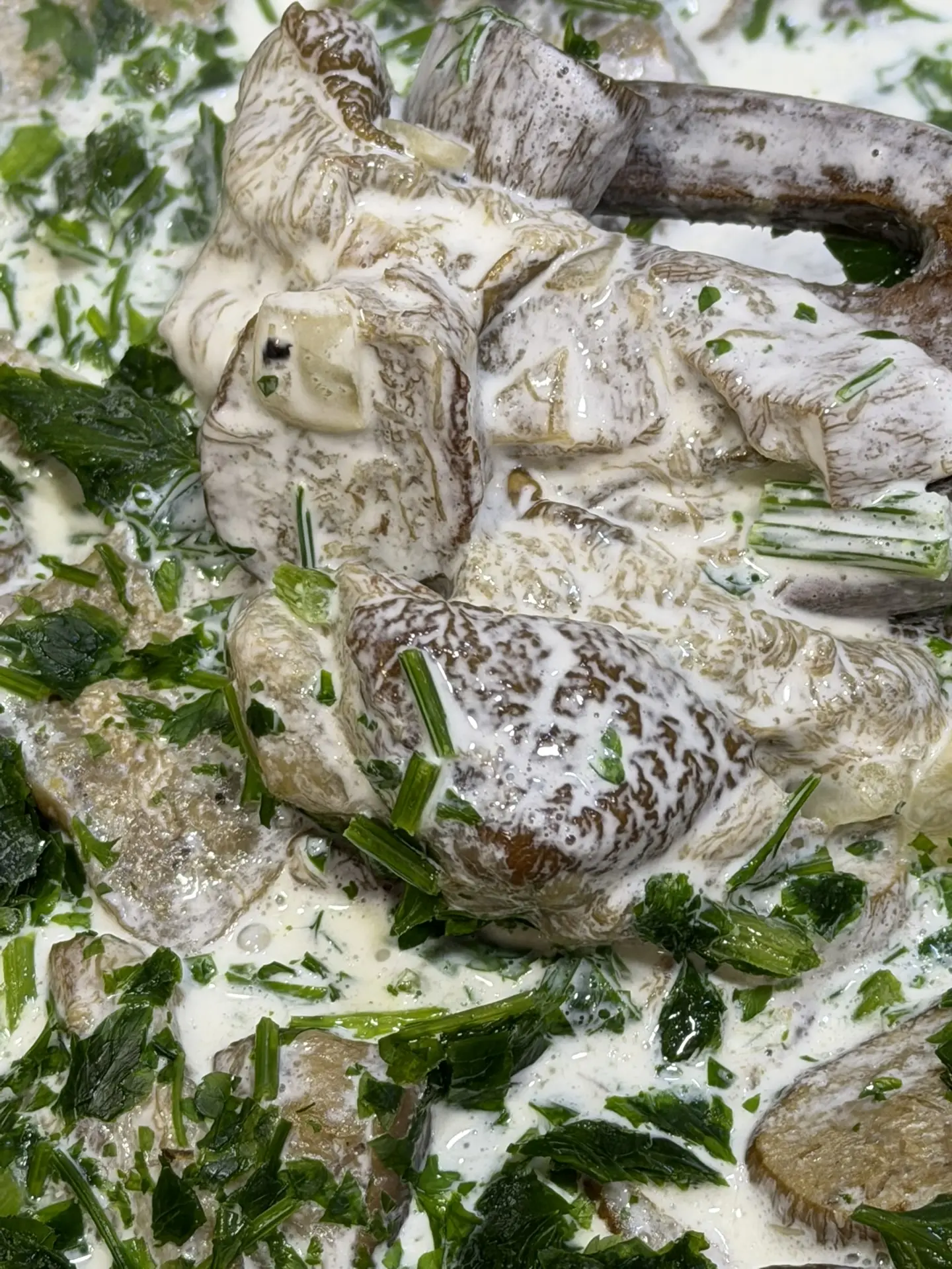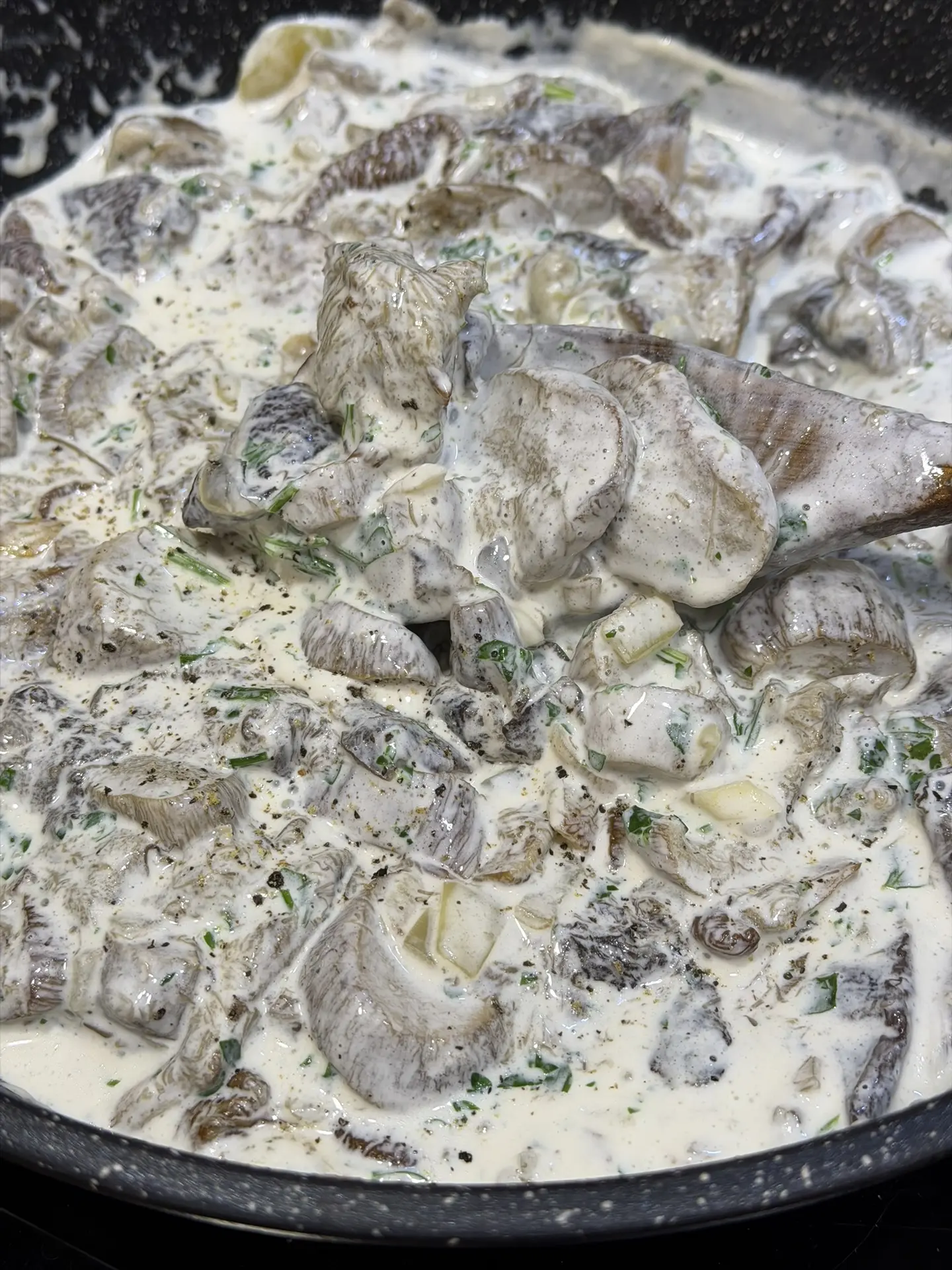 Сливки можно взять 10% и даже сметану, но тогда в грибы добавьте немного муки, перемешайте и добавляйте сметану или сливки и тогда ничего не свернется и получится нежная консистенция.