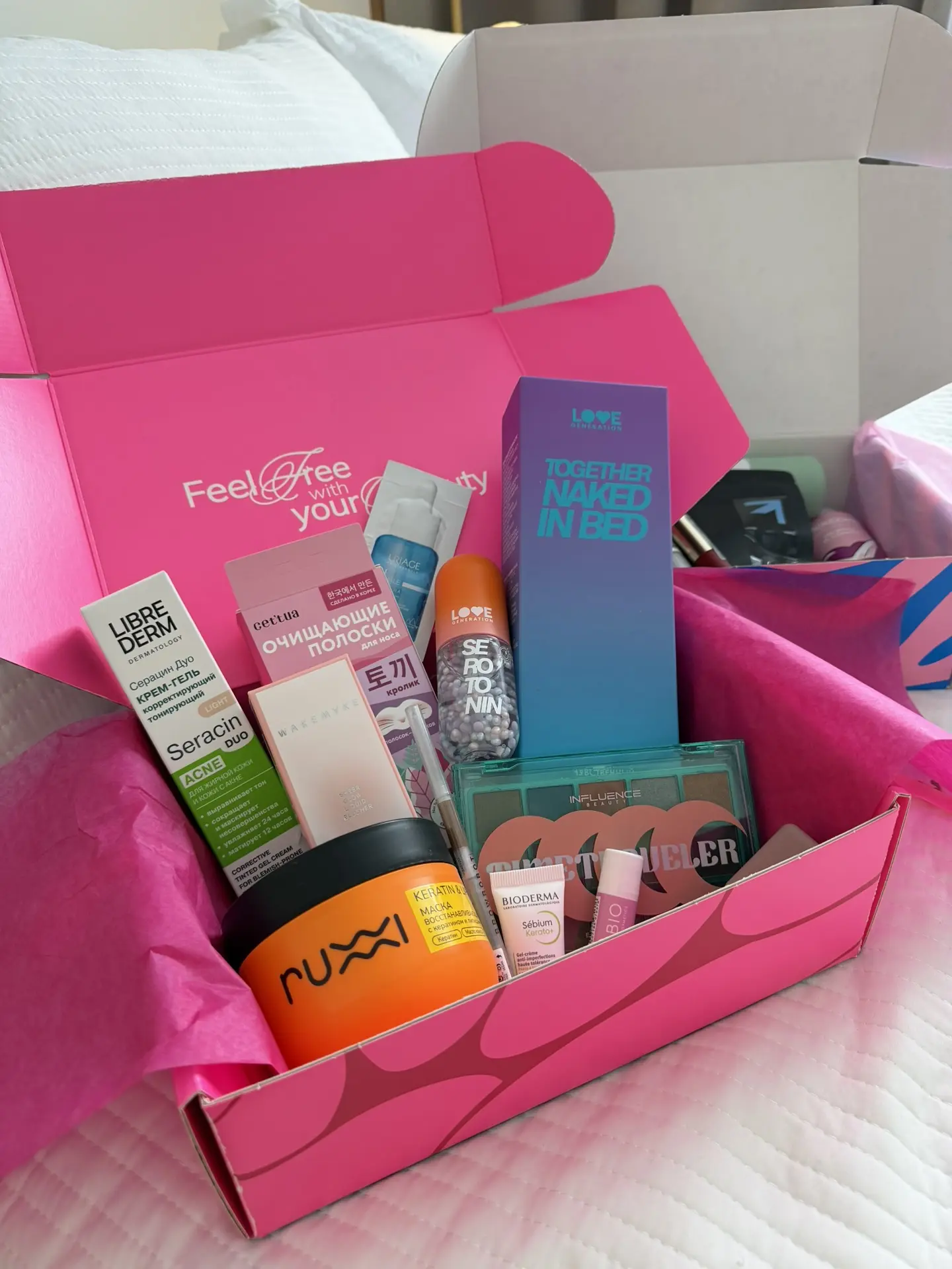 И это только часть наполнения, а по стоимости 2 продукта уже окупают цену всего бокса. Внутри ещё помада и бальзам для губ, крем для лица, базовый карандаш для бровей, аромадиффузор и другие классные продукты от Vivienne Sabo, Bioderma, Love Generation, Influence beauty и др.