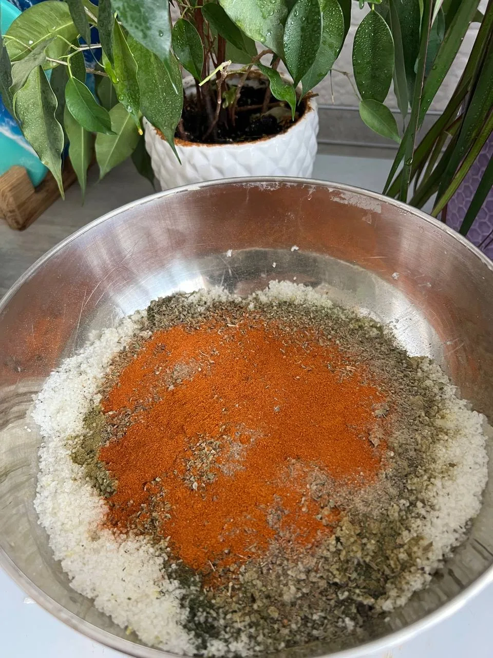 · В миске смешайте соль, сахар и молотый чёрный перец.