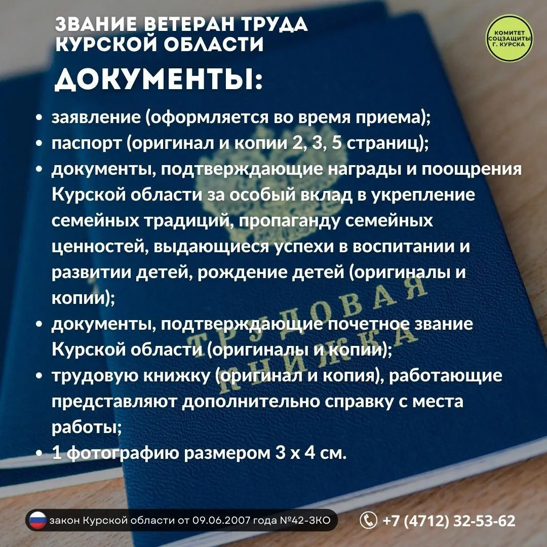 ✒ Напоминаем Вам, что на основании ст.1 закона № 42-ЗКО для присвоения звания Ветеран труда Курской области необходимо наличие одного из следующих условий: