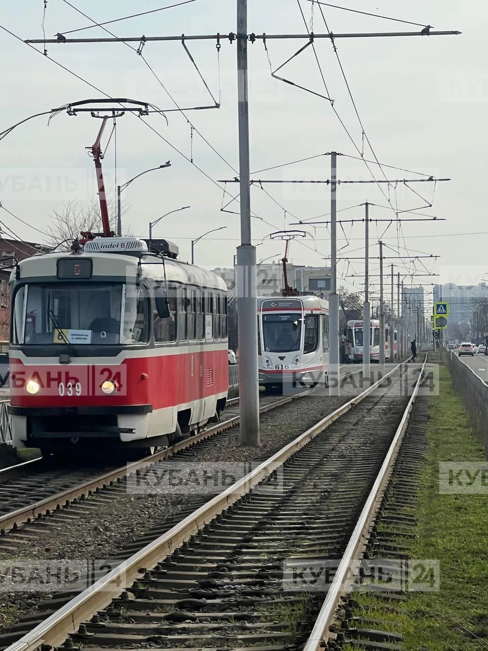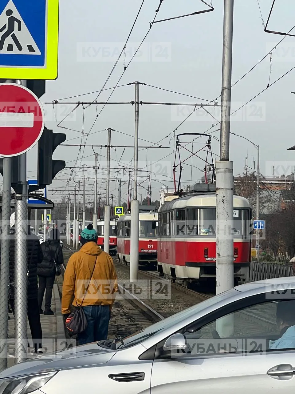 🚃 Трамваи остановились в районе пересечения улиц Калинина и Каляева в Краснодаре.