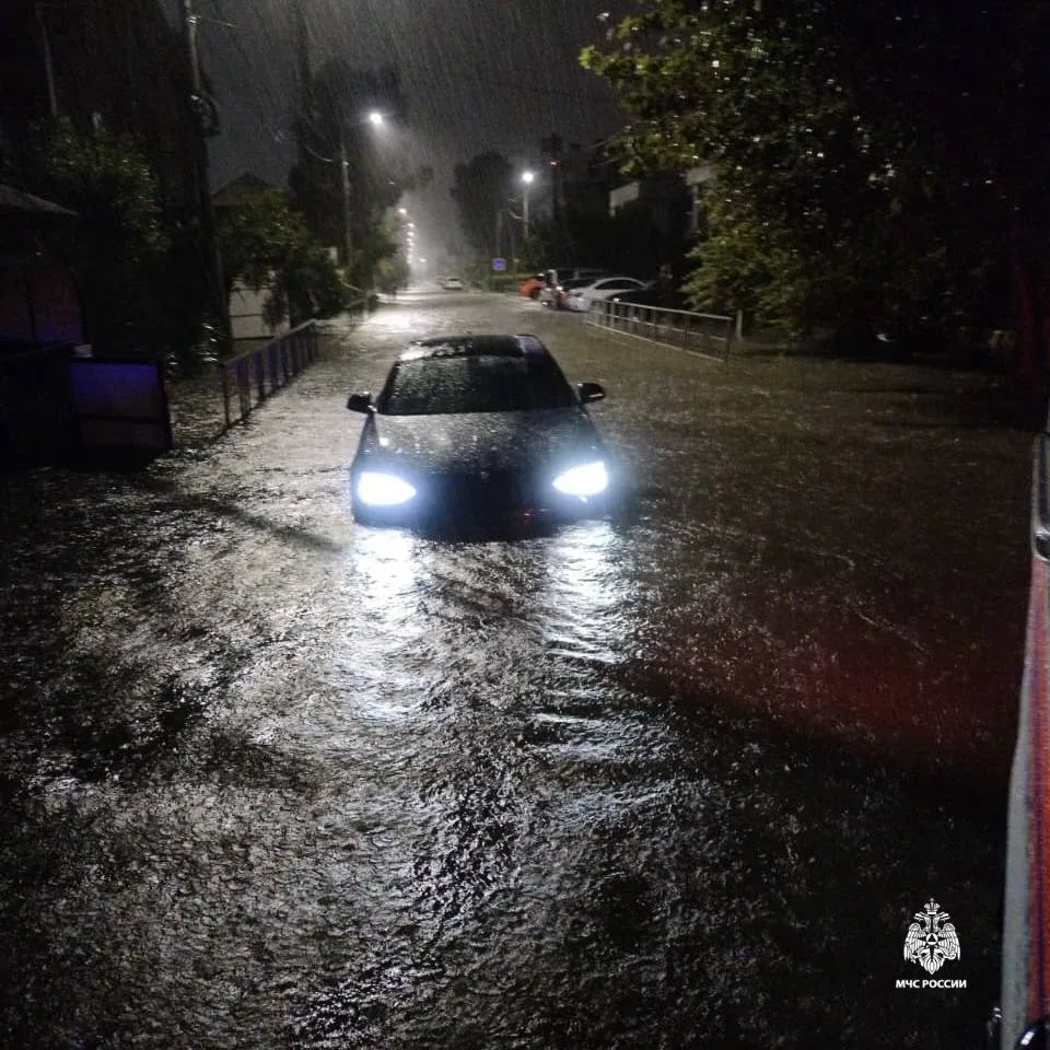 После ночного ливня по улицам Сочи побежали потоки воды, затруднено движение автомобилей. Есть единичные случаи подтоплений, которые устраняют службы города.