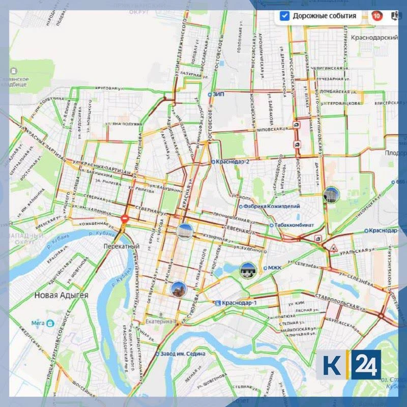 🚦Дождь и пятница подняли уровень пробок в Краснодаре до 10 баллов.