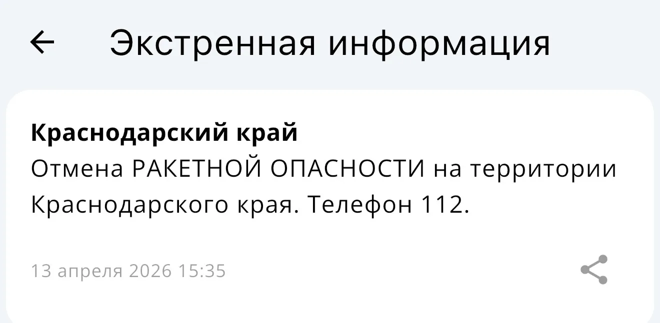 Отмена РАКЕТНОЙ ОПАСНОСТИ на территории Краснодарского края