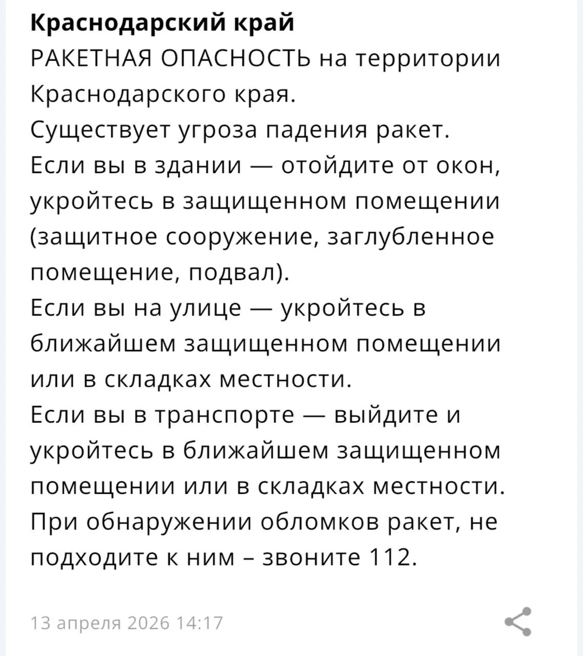 ❗️ На территории Краснодарского края объявлена «Ракетная опасность»