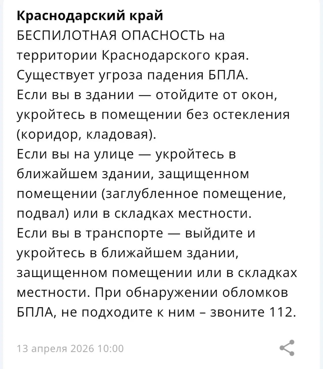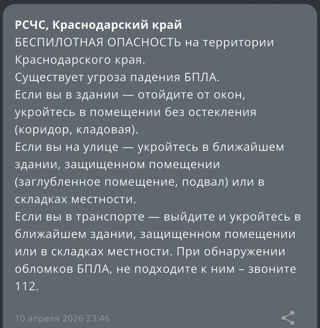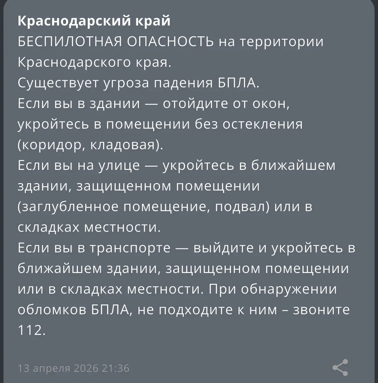 ❗️ На территории Краснодарского края объявлена «Беспилотная опасность».