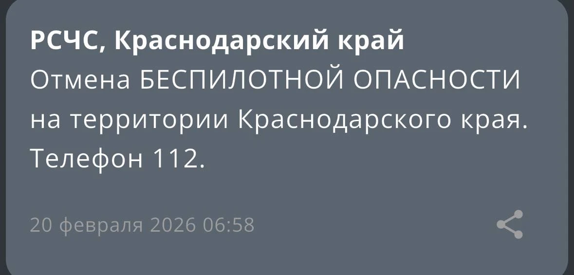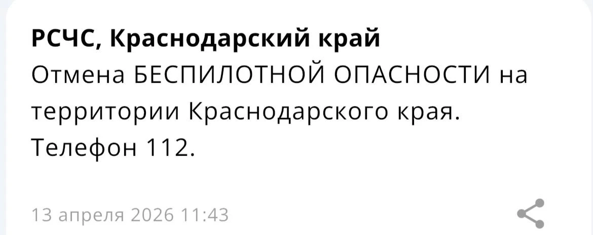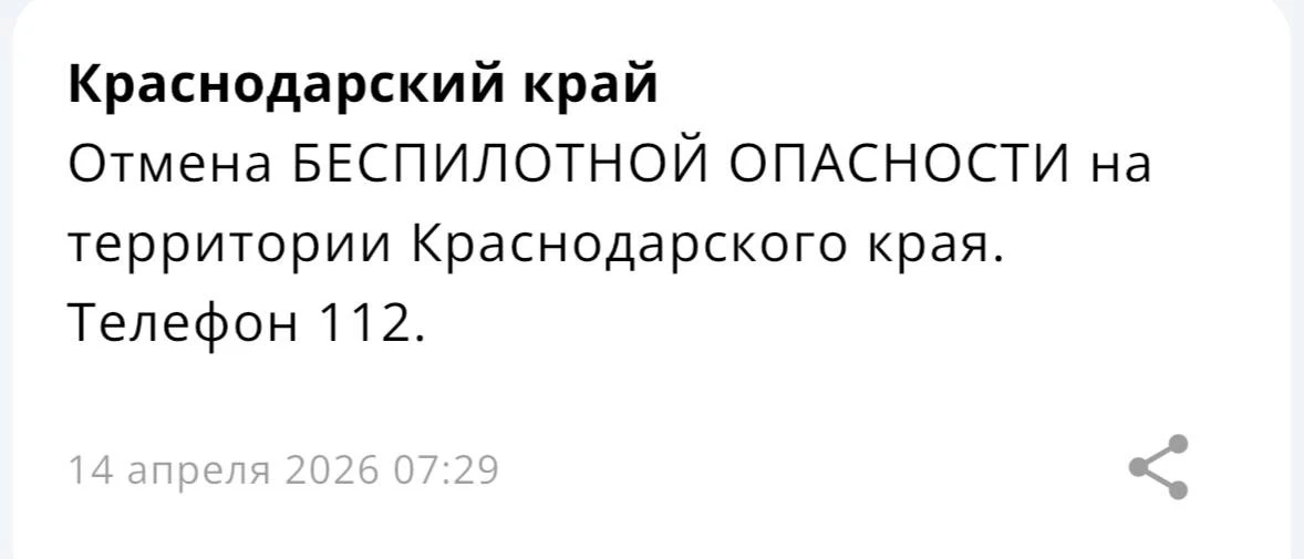 ⚠️ На территории Краснодарского края объявлена отмена угрозы «Беспилотная опасность»