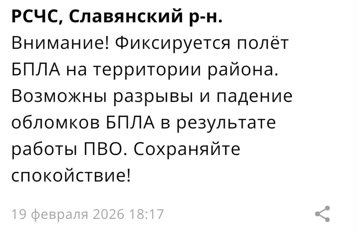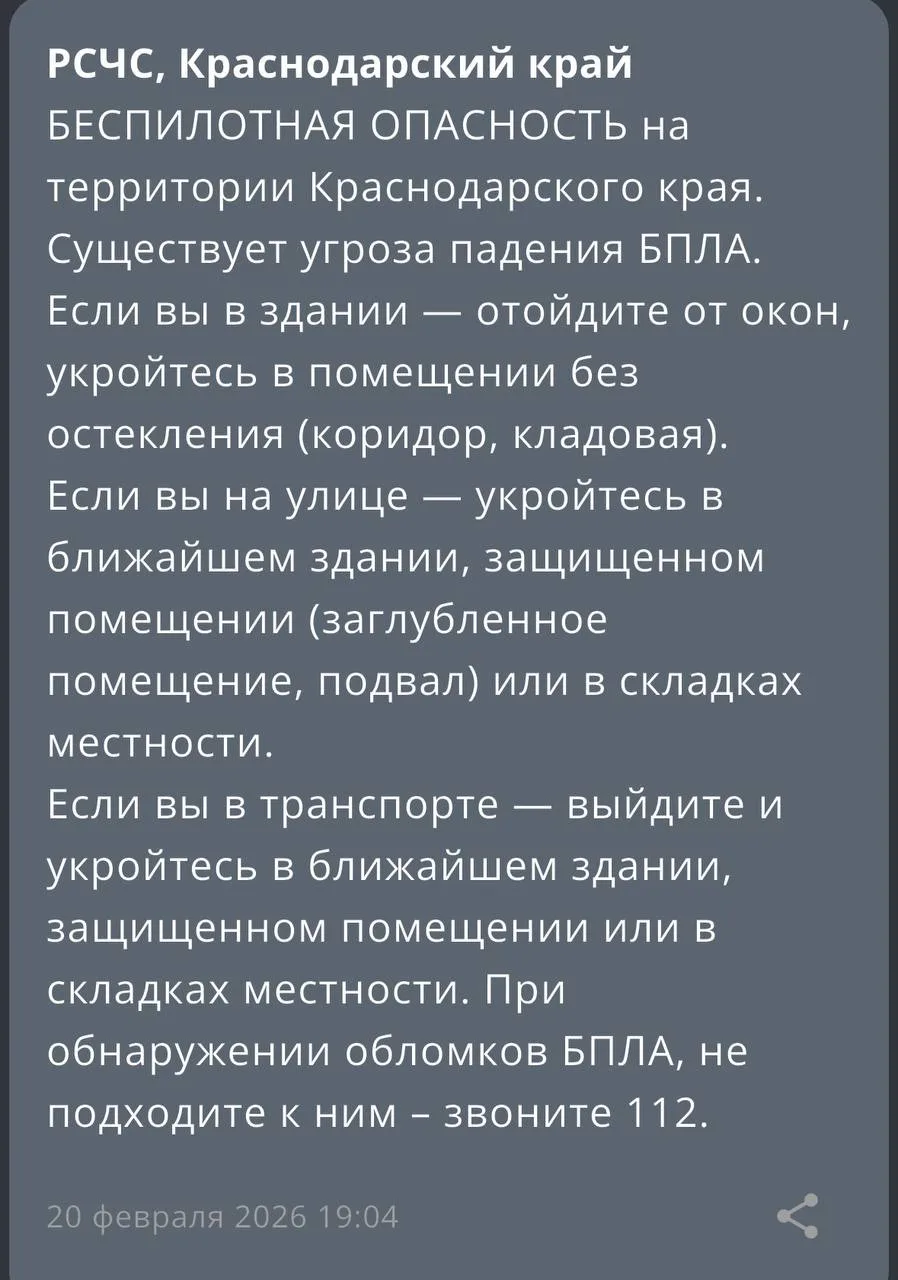 ⚠️17 БПЛА уничтожено над территорией Краснодарского края в период с 23.00 мск 19 февраля до 7.00 мск 20 февраля