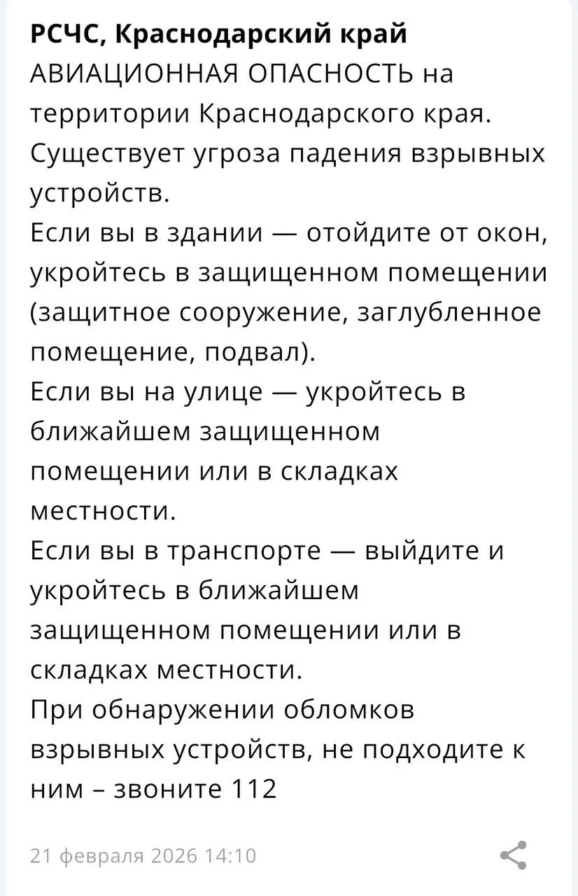 ❗️ На территории Краснодарского края объявлена «Авиационная опасность».