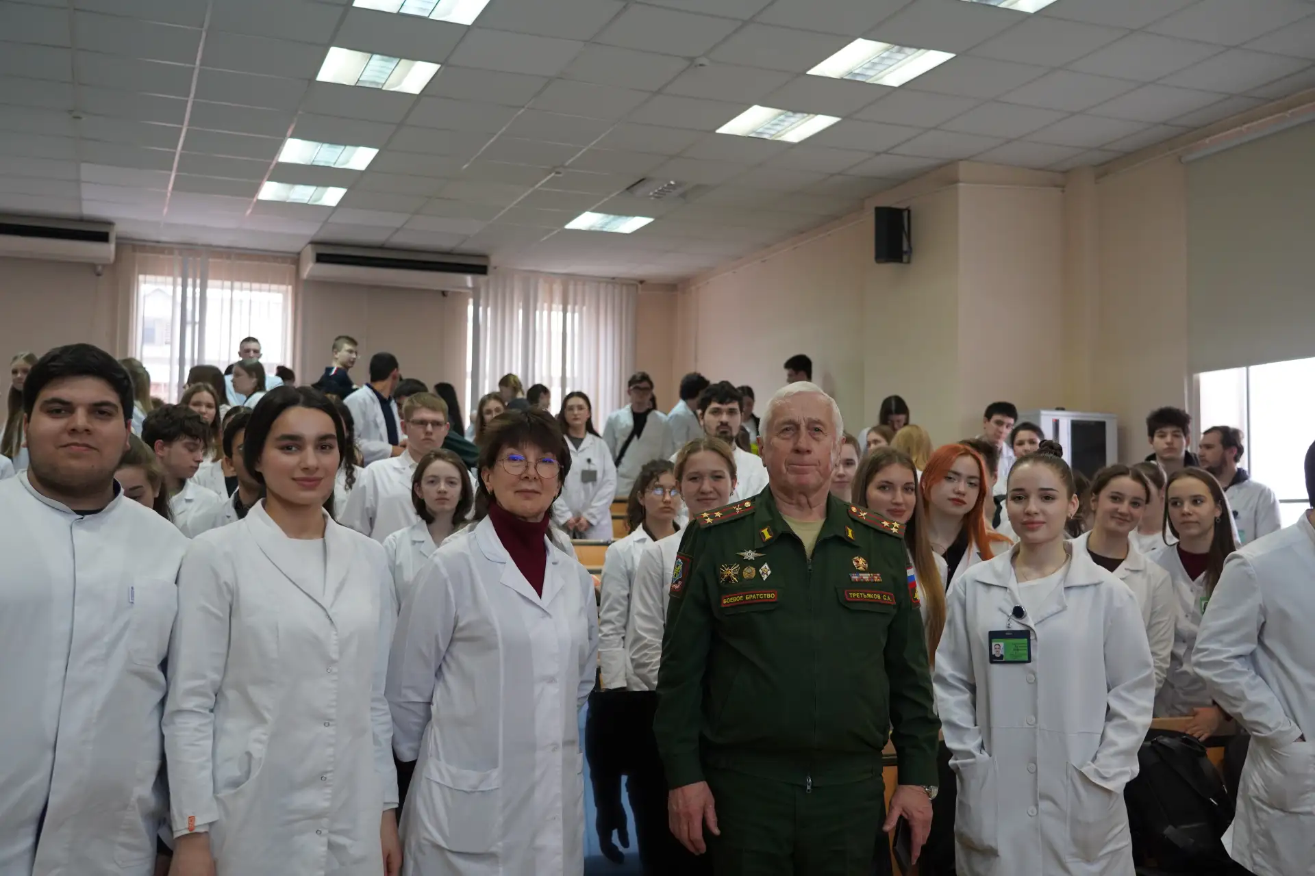 📆19 февраля, в канун Дня защитника Отечества, в Кубанском государственном медицинском университете прошла встреча студентов 1 курса Института клинической медицины специальности «Педиатрия» с заместителем председателя краевого совета Краснодарского отделения Всероссийской организации ветеранов «Боевое братство», исполнительным директором Краснодарского регионального отделения Российского военно-исторического общества Сергеем Третьяковым. Мероприятие было организовано кафедрой мобилизационной подготовки здравоохранения и медицины катастроф совместно с кафедрой философии.
