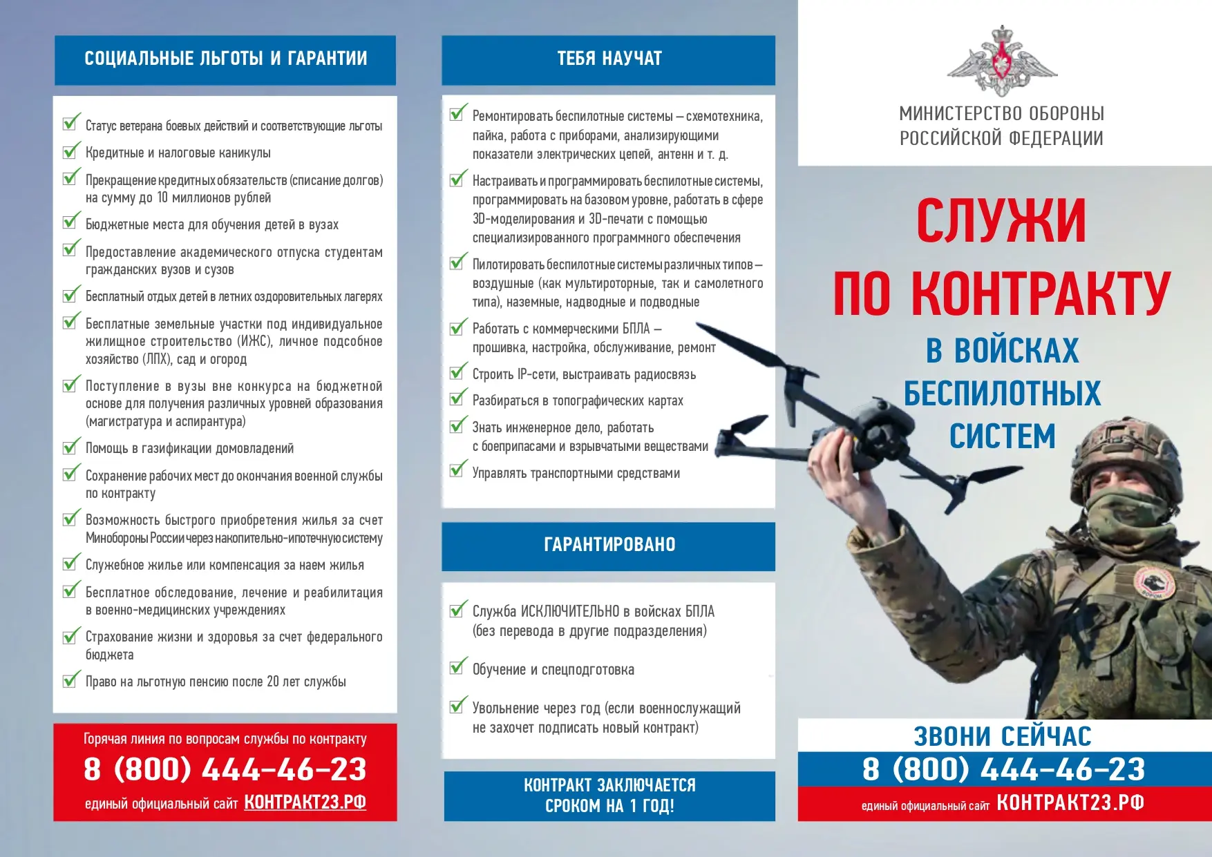 Открыт набор на контрактную службу сроком на 1 год в подразделения БПЛА. Военнослужащие проходят обучение пилотированию и обслуживанию беспилотных систем, получают навыки программирования, работы с электроникой и современными технологиями.