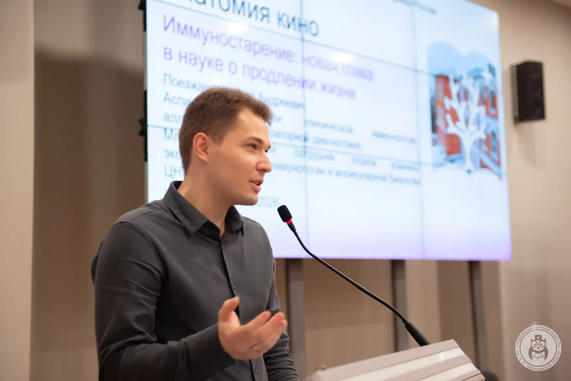 Спикером выступил Елисей Поезжаев — аспирант кафедры клинической иммунологии, аллергологии и лабораторной диагностики, младший научный сотрудник отдела клинико-экспериментальной иммунологии и молекулярной биологии ЦНИЛ.