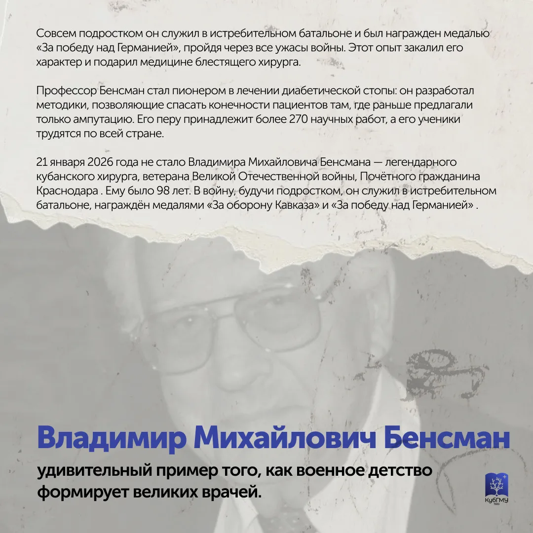 Владимир Михайлович Бенсман – ветеран Великой Отечественной войны, награждённый медалями «За оборону Кавказа», «За победу над Германией», «За доблестный труд в Великой Отечественной войне», «За выдающийся вклад в развитие Кубани» III степени. Он посвятил более 30 лет хирургии, спасая жизни и передавая знания новым поколениям врачей.