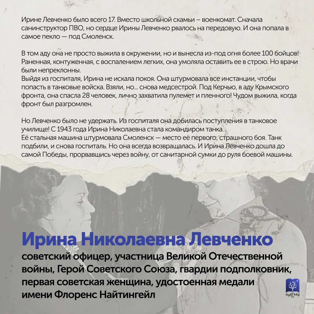 👩⚕️ Студентка 1 курса Светлана Беджаше выступила с докладом, посвященным 105-летию со дня рождения Героя Советского Союза Федора Лузана, которое отмечается 21 февраля. В своем выступлении она рассказала о жизненном пути и подвиге героя, который в годы Великой Отечественной войны был студентом второго курса КМИ (КубГМУ).