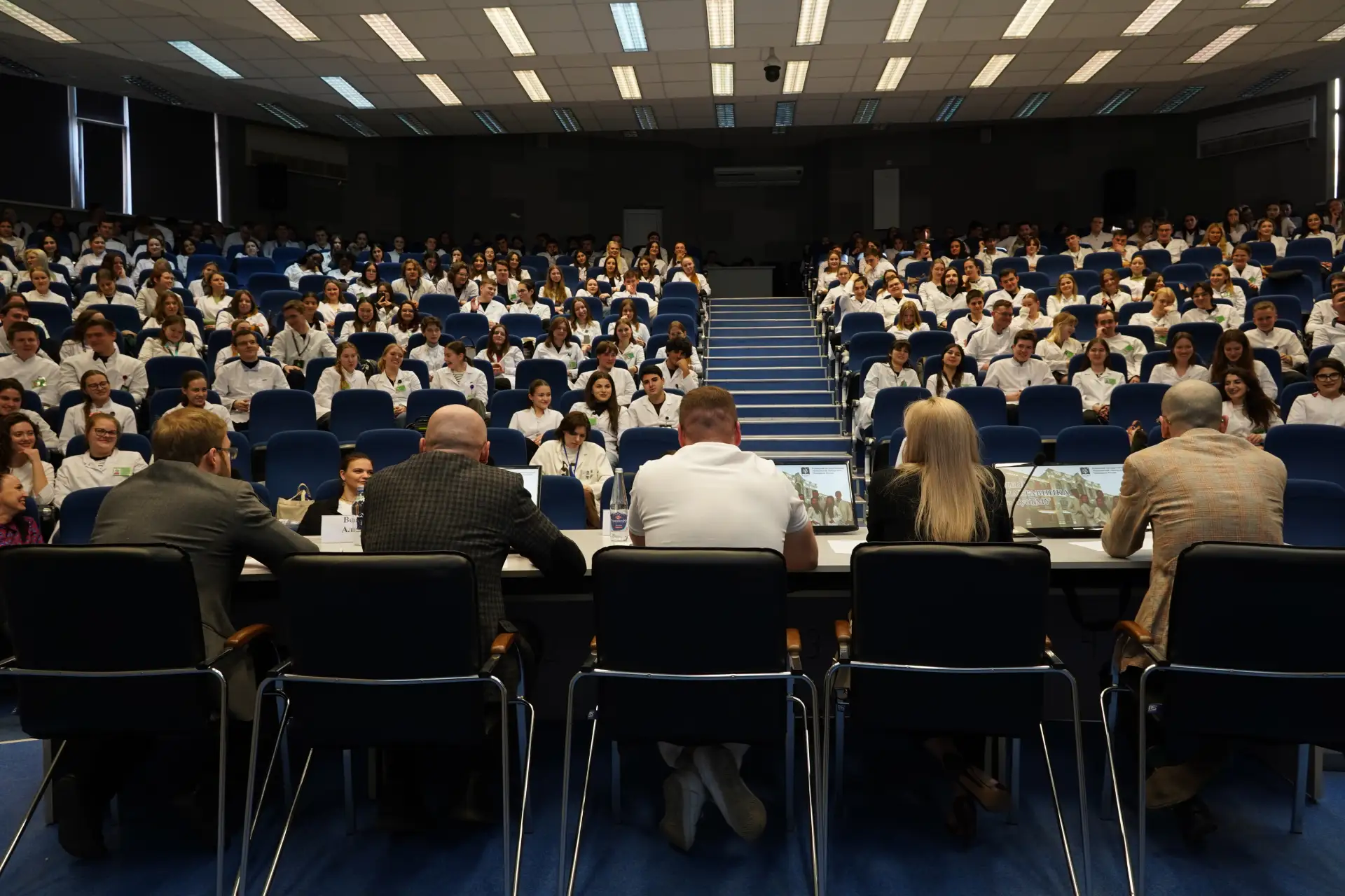 ➡️ Гостями встречи стали выпускники разных лет: Анастасия Гамазенкова, Самир Ризаев, Владимир Полищук, Александр Веревкин и Марк Деренский. Они поделились личным опытом — о первых днях в университете, страхах перед сессией, сложностях учебы и переходе от статуса студента к практикующему врачу.