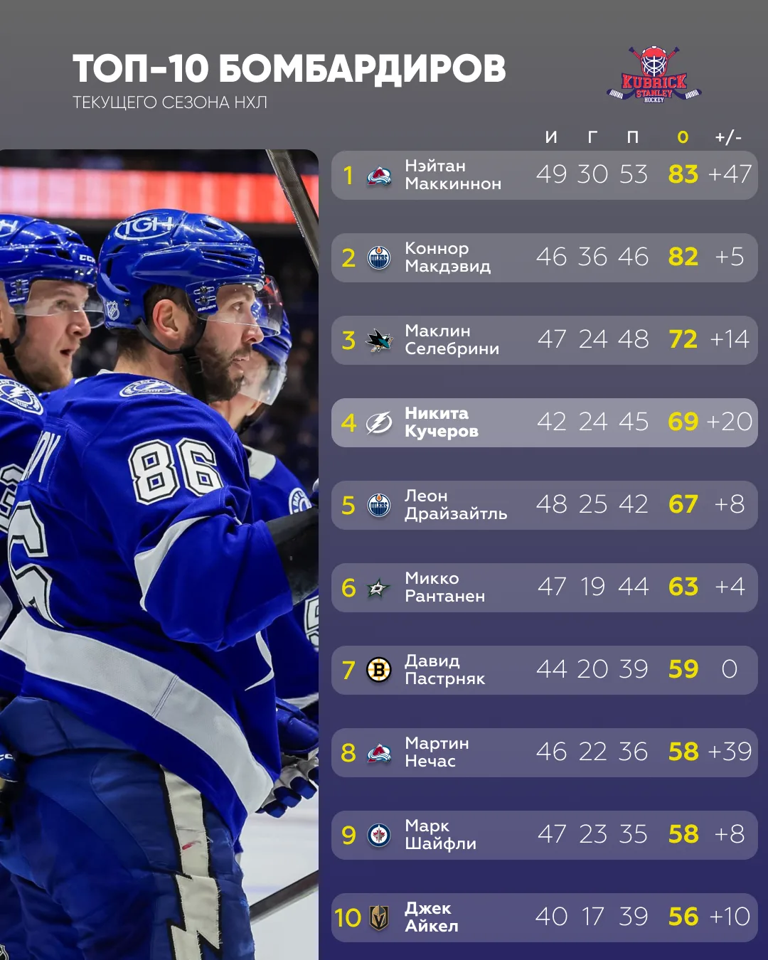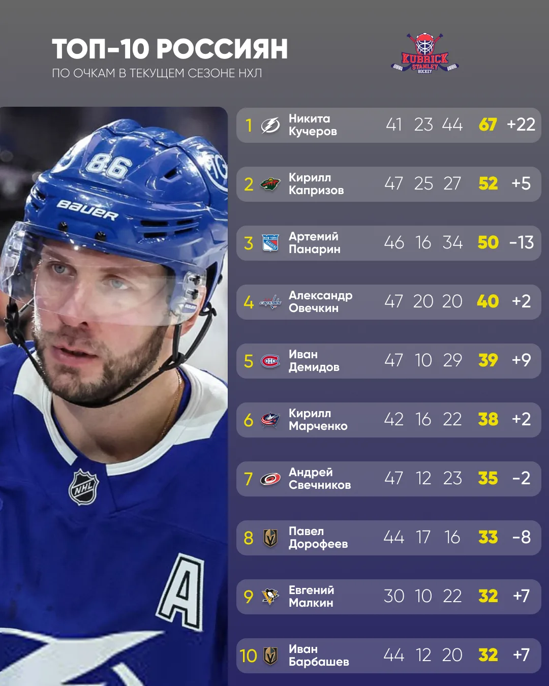Кучеров, кажется, останется первым уже до конца регулярки. Капризов и Панарин сражаются за второе место.