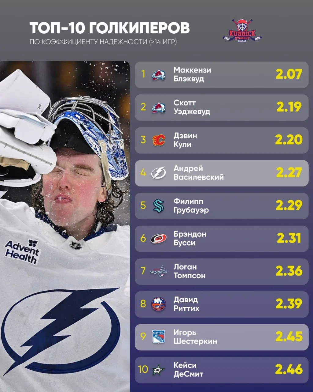 🇷🇺 Василевский и Шестеркин — в топ-10 голкиперов НХЛ по коэффициенту надежности